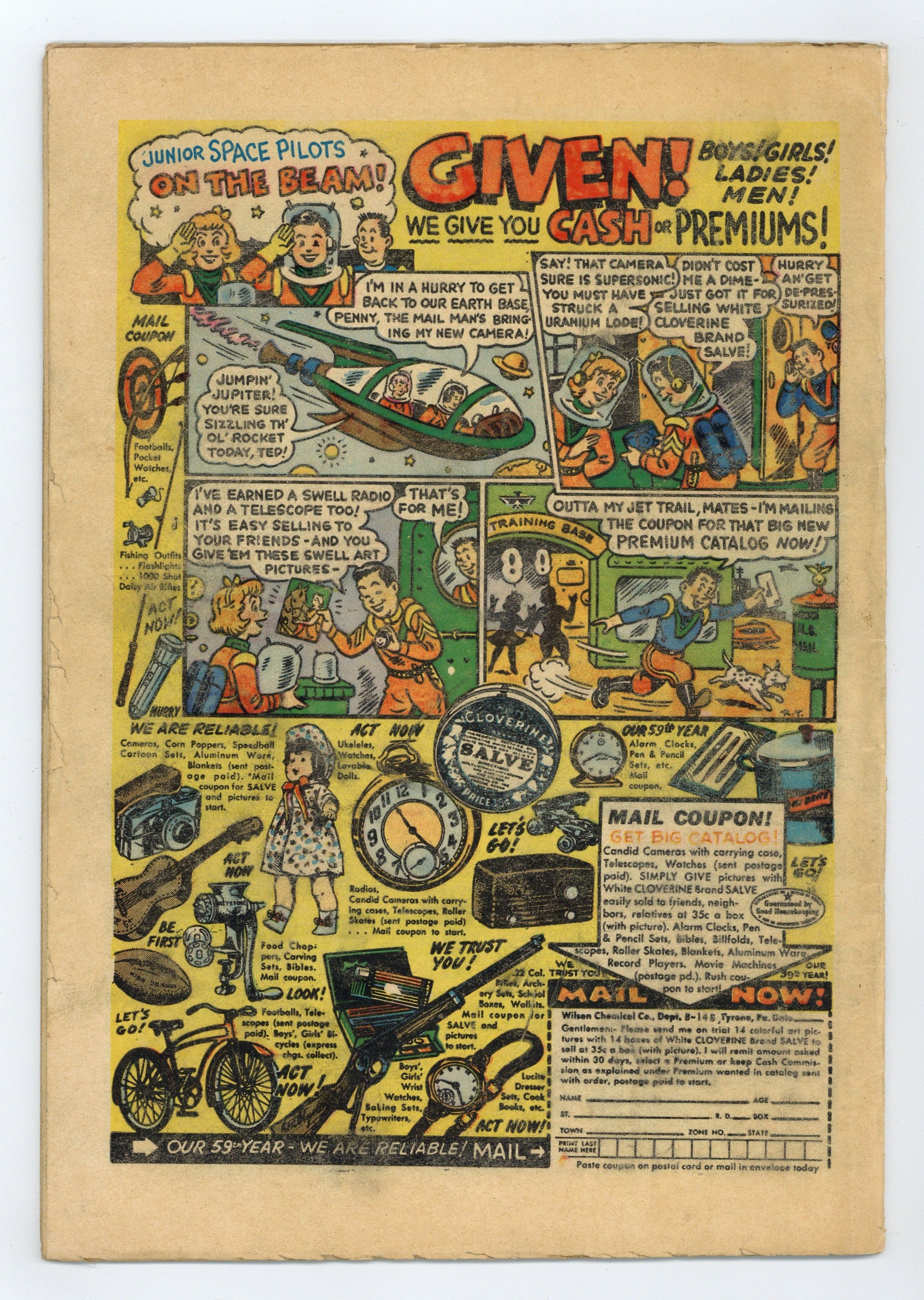 Starts Apr 4 Cover art by Bill Everett. The Final Hour, art by John Forte; Earthmen build a space armada to attack the outer galaxy, but they invoke the wrath of a powerful creature. In Disguise, art by Myron Fass; A human spy wearing two disguises penetrates the Martian emperor's palace to acquire Earth invasion plans. The Purple Shoes text story. The Last Man On Earth; A man in a shelter after an alien attack opens the vault door for a female survivor. The Long Sleep, art by C. A. Winter; A man looks to duplicate Rip van Winkle's sleep. No Place To Go, art by Mac Pakula; In the year 2003 it is agreed that war is the best solution to overpopulation. 36 pgs. $0.10. Cover price $0.10. Grade: FR 1.0 explanation of grade Condition: Used (collectible)
