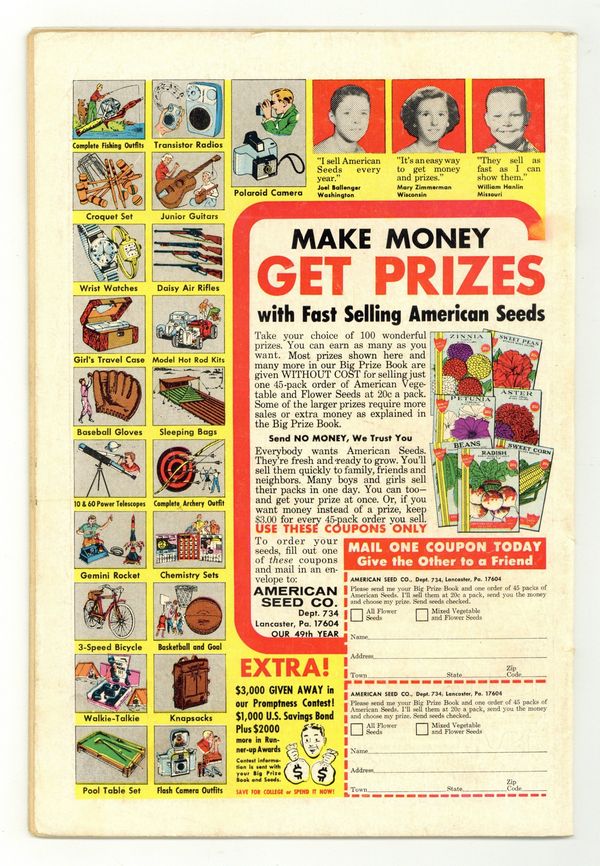 Starts Apr 20 Cover pencils by Carmine Infantino, inks by Joe Giella. "The Penguin Takes a Flyer--Into the Future!", script by Gardner Fox, pencils by Sheldon Moldoff (as Bob Kane), inks by Joe Giella; Penguin attempts to fool the Caped Crusaders into believing that his new tricks are based on futuristic technology. When this fails and his gang is captured the Fowl villain begins using robotic umbrellas against the Dynamic Duo. Letters from letter hack Guy H. Lillian III and Marvel colorist and assistant editor Irene Vartanoff. Cap's Hobby Hints activity half-page by Henry Boltinoff. Countdown on Excellence public service, script by Jack Schiff, art by Sheldon Moldoff; Jerry gets a lecture from his father on the importance of doing every job right. 36 Pages, Full Color. Cover price $0.25. Grade: VG- 3.5 explanation of grade Condition: Used (collectible)