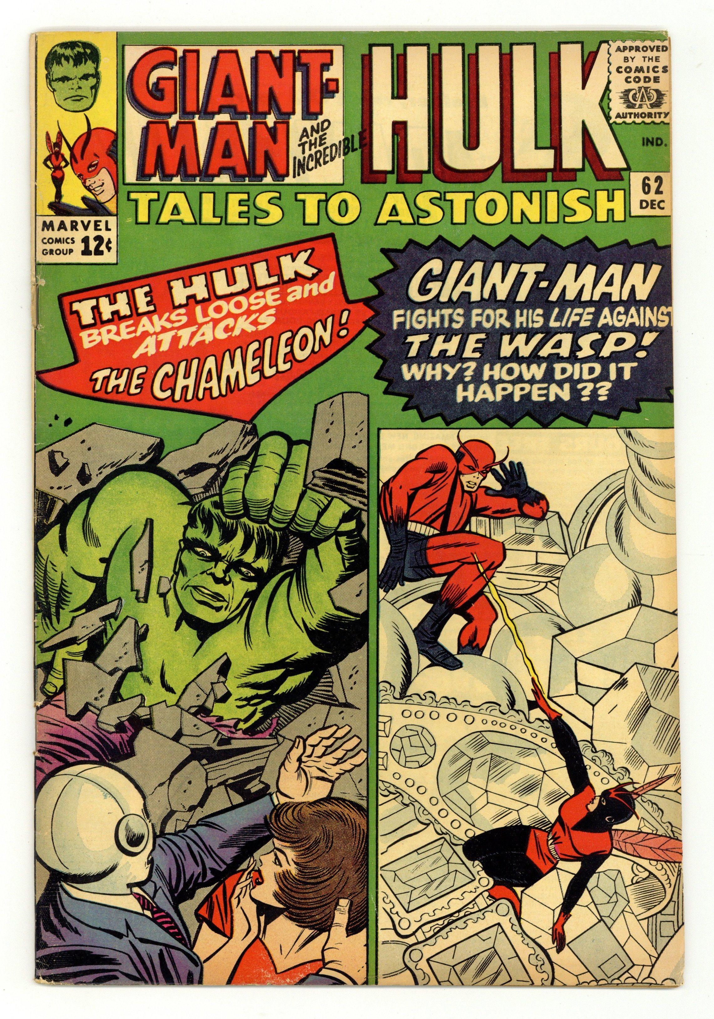 Starts Apr 20 Cover by Jack Kirby and Chic Stone. Giant-Man Versus the Wonderful Wasp!, script by Stan Lee, art by Carl Burgos and George Roussos; When Hank accidentally knocks himself out after a failed lab experiment, a petty thief makes off with his costume and begins to use the Giant-Man powers to commit crimes. Promo for Journey Into Mystery #110, Tales of Suspense #60, Strange Tales #127 and Sgt. Fury #12 reprinting their covers, art by Jack Kirby and Chic Stone. Enter...the Chameleon!, script by Stan Lee, art by Steve Ditko and George Roussos (as George Bell); The Hulk is captured in unbreakable restraints but slips through them when he turns back into Banner; Hearing that his buddy has been captured, Rick leaves Cap's side to go help his original super pal; The mysterious Leader sends the Chameleon to gamma base to find out what happened to an agent who didn't report back in. A Marvel-Masterwork Pin-Up of Hulk, art by Jack Kirby and George Roussos. 36 pgs., full color. $0.12. Cover price $0.12. Grade: VG 4.0 explanation of grade Condition: Used (collectible)