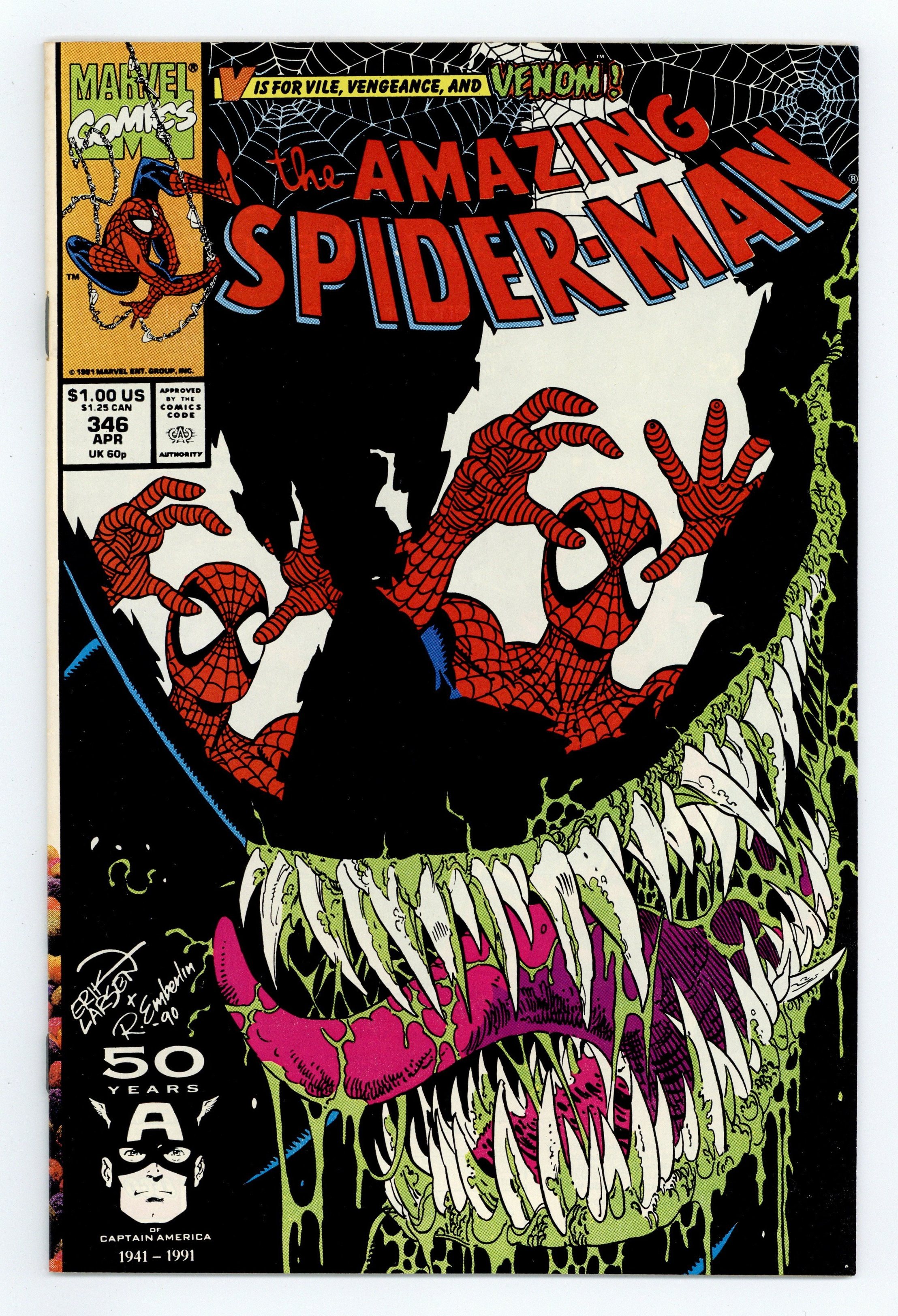 Starts Apr 20 Direct Edition. Cover pencils by Erik Larsen, inks by Randy Emberlin. "Elliptical Pursuit!", script by David Michelinie, pencils by Erik Larsen, inks by Randy Emberlin; Eddie Brock is backā¦for Peters head!; After escaping prison, Venom taunts Spider-Man into a final showdown; Peter Parkers known for his smarts--why then does he stumble straight into Venoms trap?; An all-out smack down slugfest ensues. 36 pgs., full color. Cover price $1.00. Grade: VF 8.0 explanation of grade Condition: Used (collectible)