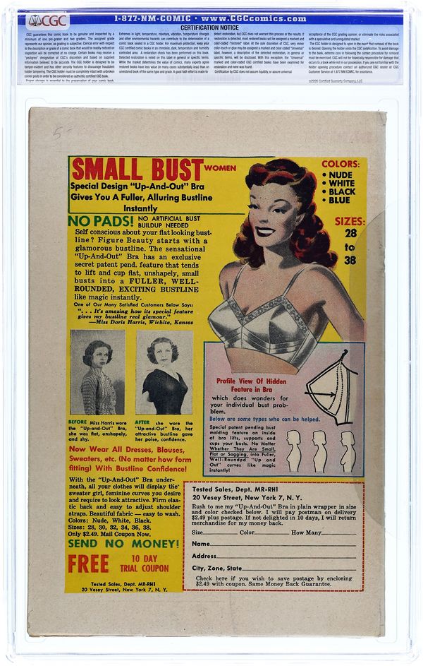 Cover art by Walter Johnson. "Experiment with Love!", art by Al Fass; Nurse Phyllis loves Dr. John, and when hes promoted to resident surgeon at the clinic, they make wedding plans; However, he falls for wealthy Valerie and breaks up with Phyllis. "Love on the Run," art by Bob Mack; Dianne and her husband Jerry spend a weeks vacation with a wealthy client; Dianne is impressed by handsome Pietro, and when Jerry cuts his vacation short to fly to an engineering project in trouble, Dianne refuses to accompany him. "Bluebeard's Eleventh Wife" text story. "Love Conquers All"; Marcy is directing the towns amateur theatre show; Jessica brings in professional singer Crane to help; He says Marcy will have a great show business career and she falls in love with him; But Crane is recalled to military service for the Korean War and dies in a plane crash. "K.O. for Cupid," art by Walter Johnson; Student Janey has a crush on college professor Peter, but "campus coquette" Marla also wants him; Janey sees Marla kissing Peter and is angry, although Peter later claims Marla was the aggressor; Janey and Peter are stranded on an island after their boat sinks during a campus activity. 36 pgs., full color. Cover price $0.10. Grade: CGC 7.0 explanation of grade Condition: Used (collectible)