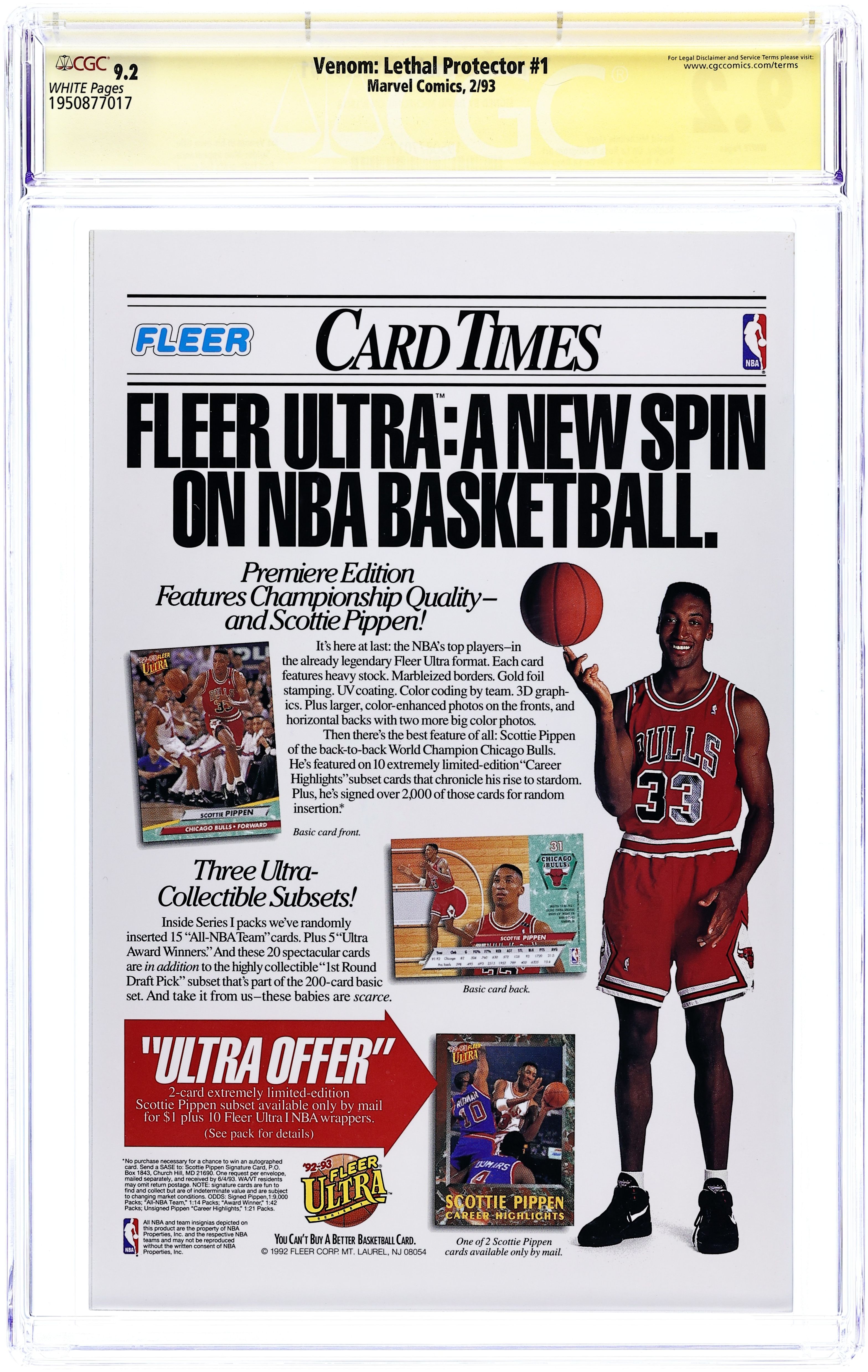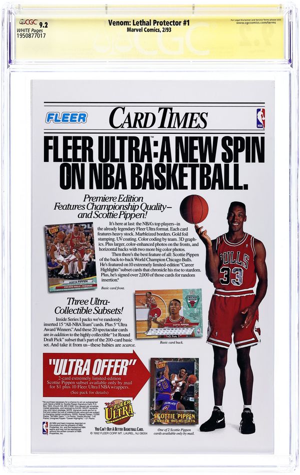 Direct Edition. Red Foil Enhanced CardStock cover, art by Mark Bagley and Sam de la Rosa. Lethal Protector Part 1: Dark Soul Drifting, script by David Michelinie, pencils by Mark Bagley, inks by Al Milgrom and Sam de la Rosa; Venom moves to San Fransisco to try out his new protection of innocents racket; Venom and Spidey save a group of homeless folk. 36 pgs., full color. $2.95. Cover price $2.95. Grade: CGC 9.2 explanation of grade Condition: Used (collectible)