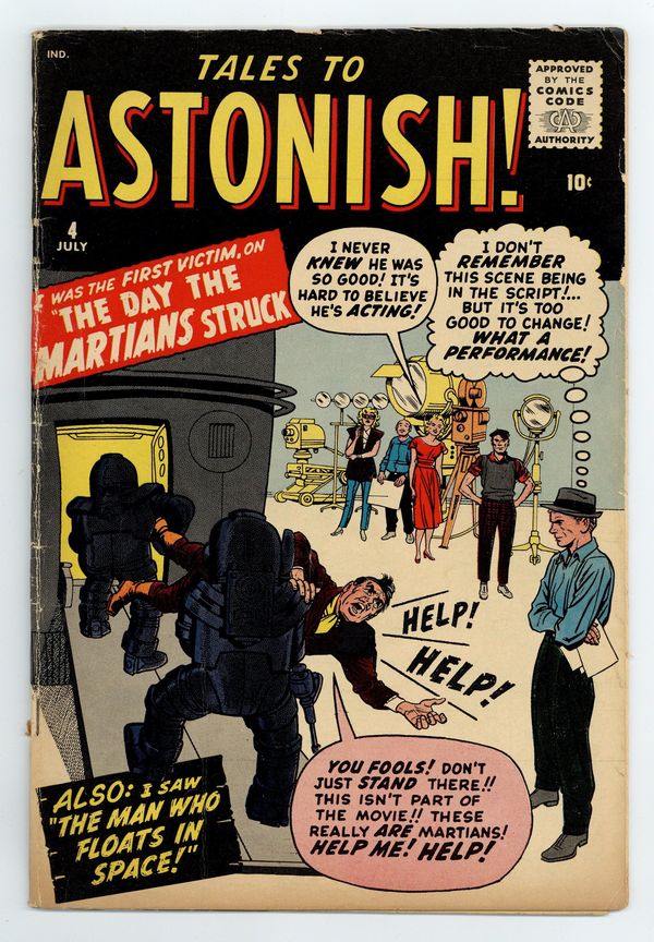 Cover by Jack Kirby and Christopher Rule. I Was a Prisoner of the Martians!, art by Joe Sinnott; A bullying director is kidnapped by Martians using the science fiction movie he's filming as a cover. Masquerade text story. My Forbidden Paintings!, art by Don Heck; A painter buys a magic brush with the power to make three paintings become real. He makes himself handsome and a famous painter. I Made Time Stand Still; An inventor accidentally makes time stand still, leaving himself the only person able to move. I Love a Mermaid!, art by Carl Burgos; A man always drawn to the sea falls in love with a mermaid. The Man Who Floats in Space!, art by Steve Ditko. 36 pgs., full color. $0.10. Cover price $0.10. Grade: VG 4.0 explanation of grade Condition: Used (collectible)