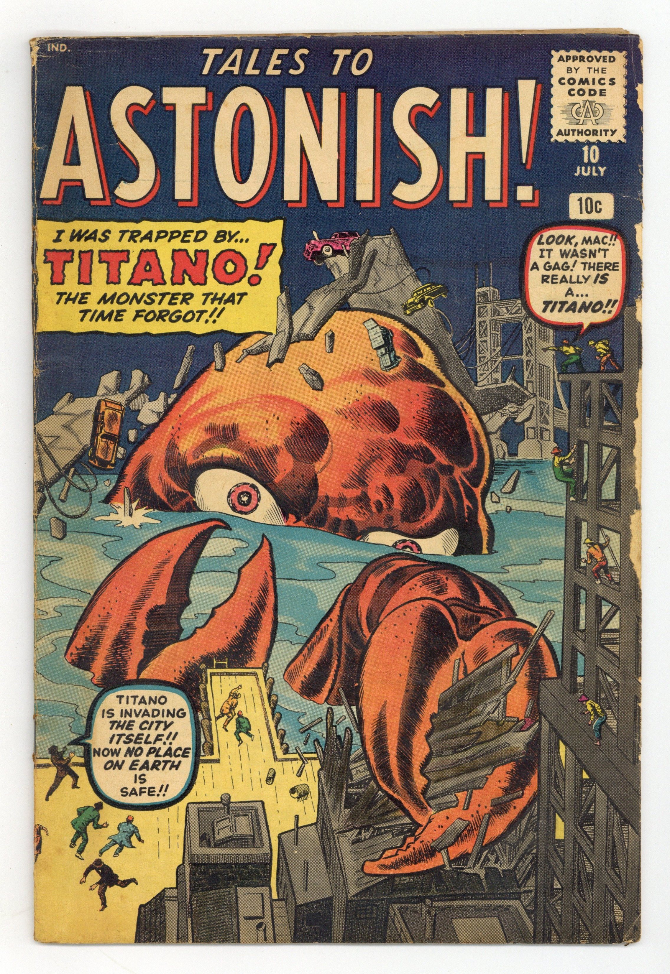 Starts Apr 4 Cover art by Jack Kirby and Steve Ditko. I Was Trapped By Titano the Monster That Time Forgot!, art by Jack Kirby and Joe Sinnott; A gigantic, mutant crab is sighted terrorizing various islands in the South Pacific. The Flying Saucer That Was text story. Only I Know When the World Will End!!!, art by Don Heck; A derelict claims to be from another world and says that another planet will collide with Earth within days, but he is believed mad. Something Lurks Inside!, art by Steve Ditko; A space explorer cannot rid his ship of vicious alien spiders, and is forced to sacrifice himself to save Earth. What Was the Strange Power of Simon Drudd!!, art by Jack Kirby and Christopher Rule; A scientist selfishly uses a youth serum to gain an advantage over other people, but the serum ages him backwards into non-existance. 36 pgs., full color. $0.10. Cover price $0.10. Grade: GD+ 2.5 explanation of grade Condition: Used (collectible)