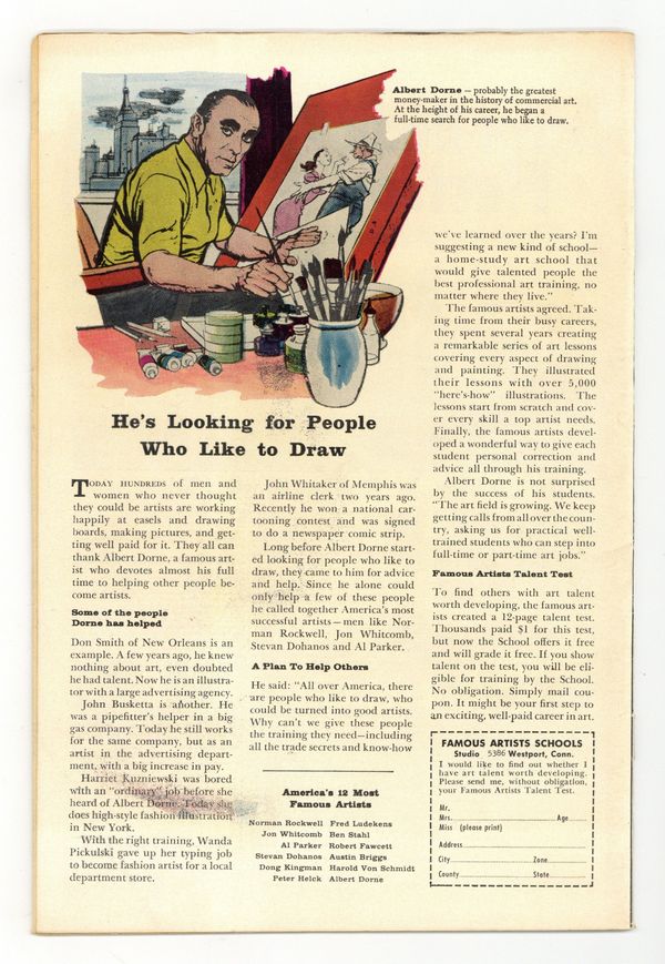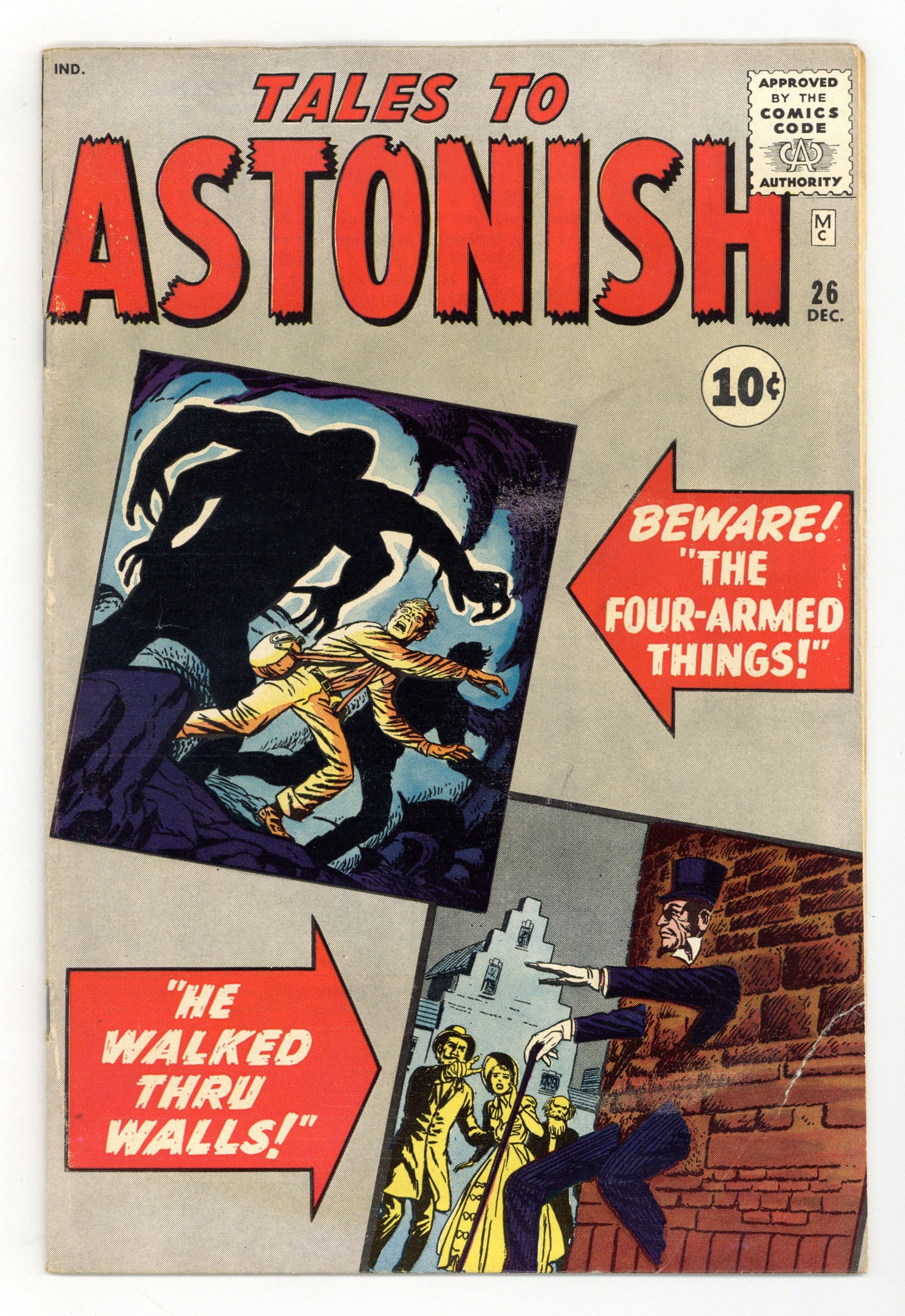 Starts Apr 4 Cover by Jack Kirby and Dick Ayers. Look Out!! Here Come the...Four-Armed Men!, art by Jack Kirby and Dick Ayers; An explorer learns of an invasion of four-armed aliens. The Weatherman, art by Joe Maneely. He Walked Through Walls!, art by Jack Kirby and Dick Ayers; A stranger performs feats of magic, and offers anything that people might want if they sign a contract. Run, Rocky, Run!, art by Bob Forgione; A criminal on the run plans to stow-away on the experimental rocket he reads about, but finds out too late that is an advanced miniature rocket that cannot carry a pilot. Dream World, script by Stan Lee, art by Steve Ditko; A man repeatedly dreams that his bed is levitating, and cant tell if hes dreaming or not. 36 pgs., full color. $0.10. Cover price $0.10. Grade: VG 4.0 explanation of grade Condition: Used (collectible)