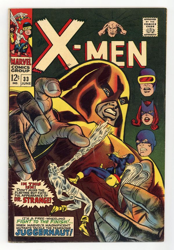 Cover pencils by Gil Kane, John Romita, and Werner Roth, inks by Gil Kane and John Romita; Juggernaut rampages to Factor Three headquarters; Professor X shows Jean a story about the ruby of Crimson Bands; Cameos by Doctor Strange and the Ancient One. Ad for the Merry Marvel Marching Society. 36 pgs. $0.12. Cover price $0.12. Grade: VG- 3.5 explanation of grade Condition: Used (collectible)