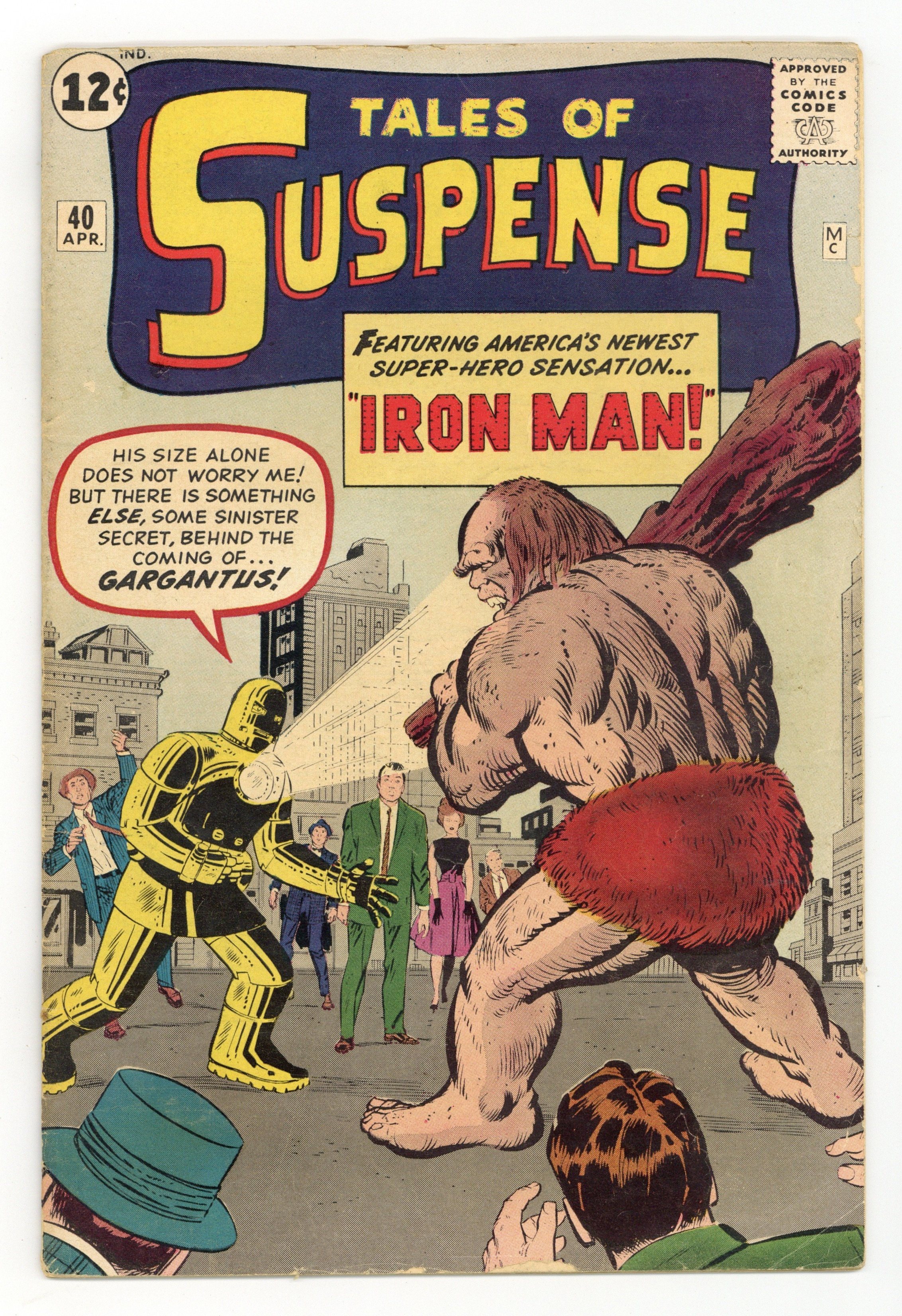 Starts Apr 4 Cover pencils by Jack Kirby, inks by Don Heck. Second appearance of Iron Man in "Iron Man versus Gargantus!", script by Stan Lee (plot) and Robert Bernstein (as R. Berns) (script), pencils by Jack Kirby, inks by Don Heck; Introduction and origin of Gargantus. "Wrong Number" text story. "Work of Art!", script by Stan Lee (plot) and Larry Lieber (script), pencils by Larry Lieber, inks by Sol Brodsky; An unsuccessful artist tries to force a new painter to show him how to paint lifelike pictures; The painter is a sorcerer, and traps the artist in one of his paintings, the secret to his realism. "Prophet of Doom!", script by Stan Lee, art by Steve Ditko; A man from the future arrives in the present day in order to set himself up as ruler; He attempts to extort 100 million dollars from the Secretary General of the United Nations only to be shocked when the Secretary reveals that he too is from the future and that there are agents planted in every era in order to apprehend criminals who may attempt to alter the course of events. 36 pages, full color. Cover price $0.12. Grade: GD/VG 3.0 explanation of grade Condition: Used (collectible)
