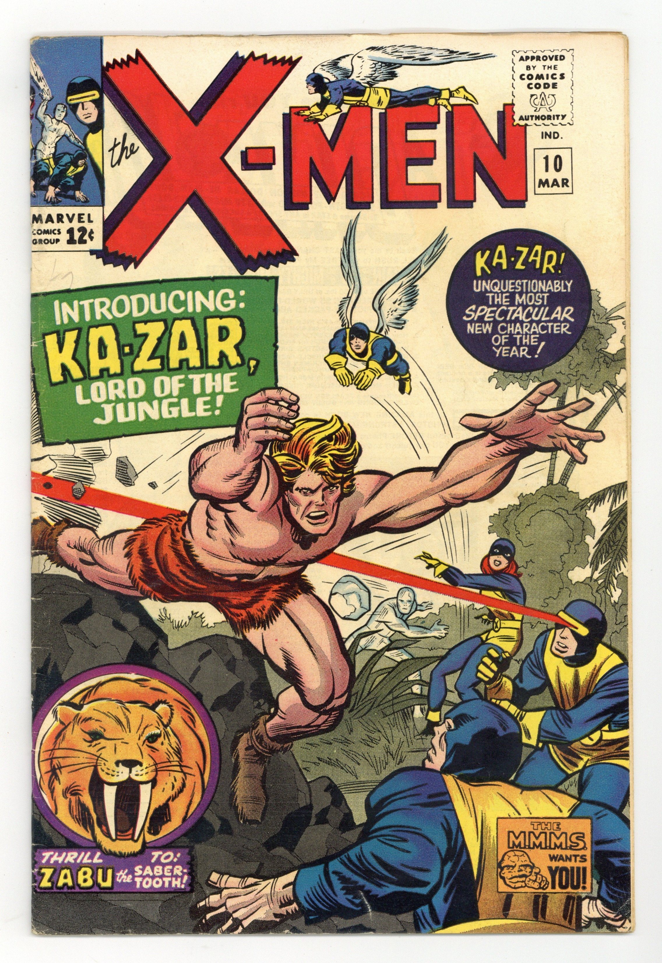 Starts Apr 4 Cover pencils by Jack Kirby, inks by Chic Stone. The Coming of Ka-Zar, script by Stan Lee, pencils by Jack Kirby, inks by Chic Stone; Even though he is not a mutant, Xavier allows the X-Men to travel to Antarctica and enter the Savage Land to investigate the noble savage, Ka-Zar; They end up having to save Jean and Warren from being sacrificed by the savage Swamp Men; 1st Silver Age Ka-Zar. (The original Ka-Zar appeared in Marvel Comics #1 and Marvel Mystery Comics between 1939 andf 1942.) 36 pgs. $0.12. Cover price $0.12. Grade: VG 4.0 explanation of grade Condition: Used (collectible)