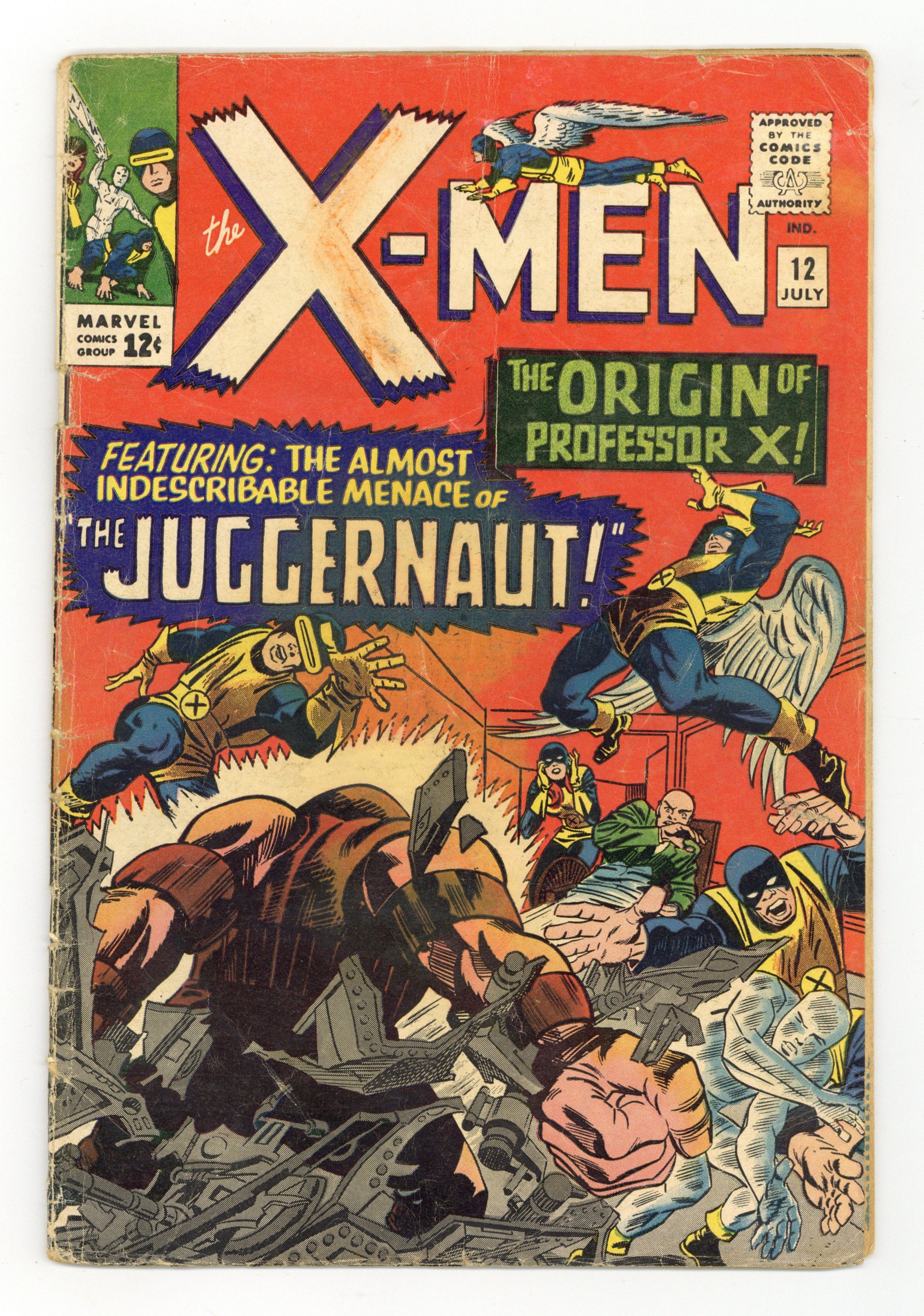 Starts Apr 4 Cover pencils by Jack Kirby, inks by Frank Giacoia. The Origin of Professor X!, script by Stan Lee, pencils by Jack Kirby (layouts) and Alex Toth (pencils), inks by Vince Colletta; Cerebro detects a powerful mutant and Xavier fears that he knows who it is; The X-Men prepare the mansion for an all out assault; As the mysterious villain batters his way through the mansion's defenses, Professor X tells his students his origin story and how his step-brother changed from tormenting bully to an unstoppable Juggernaut; 1st appearance of the Juggernaut. 36 pgs. $0.12. Cover price $0.12. Grade: PR 0.5 explanation of grade Condition: Used (collectible)