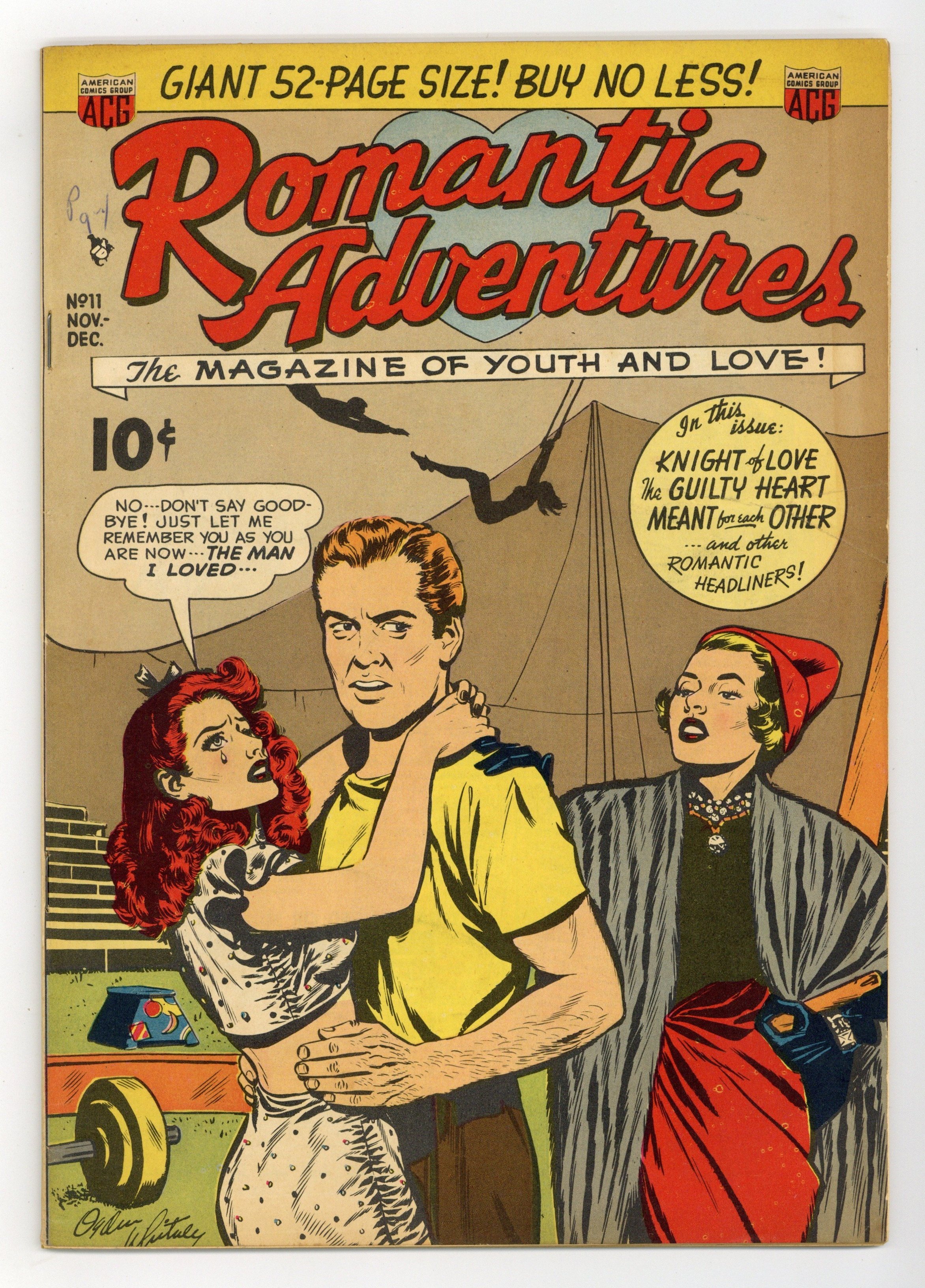 Starts May 11 Cover by Ogden Whitney. Edited by Richard E. Hughes. Art by W. G. Hargis and others. Tales of romance from legendary early independent comics publisher ACG. Norma falls for Jules while the two are translating a 13th-century love story; Two people who were jilted at the altar manage to find their way to each other; Advice on how to know if hes not the right guy. Knight of Love; The Kiss Test; Flight into Romance; Meant for Each Other; Men You Shouldn't Marry; Lesson in Heartbreak; The Romance of Little Miss Mouse; Love Charms; Women Who Never Wed; The Guilty Heart; Lost Love Letter; Look Before You Love!; How He Proposed. 48 pages, Full Color. Cover price $0.10. Grade: VG 4.0 explanation of grade Condition: Used (collectible)