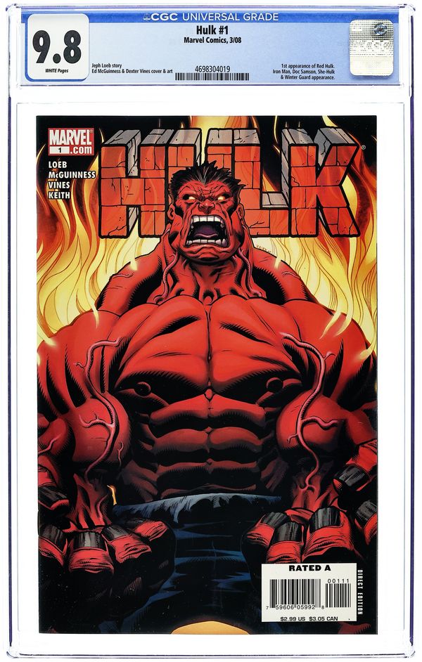 Direct Edition with $2.99 cover price. Written by JEPH LOEB Pencils & Cover by ED MCGUINNESS. Superstars JEPH LOEB and ED MCGUINNESS will change the way you see THE HULK! In this startling origin epic, the breathtaking events that ended World War Hulk rocket into this brand-new Hulk title. When one of The Hulk's oldest cast members is murdered, everyone turns to the team of IRON MAN, SHE-HULK and LEONARD SAMSON to solve the grizzly case. All the evidence points to the Hulk as the killer-but {CLASSIFIED}! Join us for a brand--new story and a brand-new team who loves the Hulk as much as you do! Cover price $2.99. Grade: CGC 9.8 explanation of grade Condition: Used (collectible)