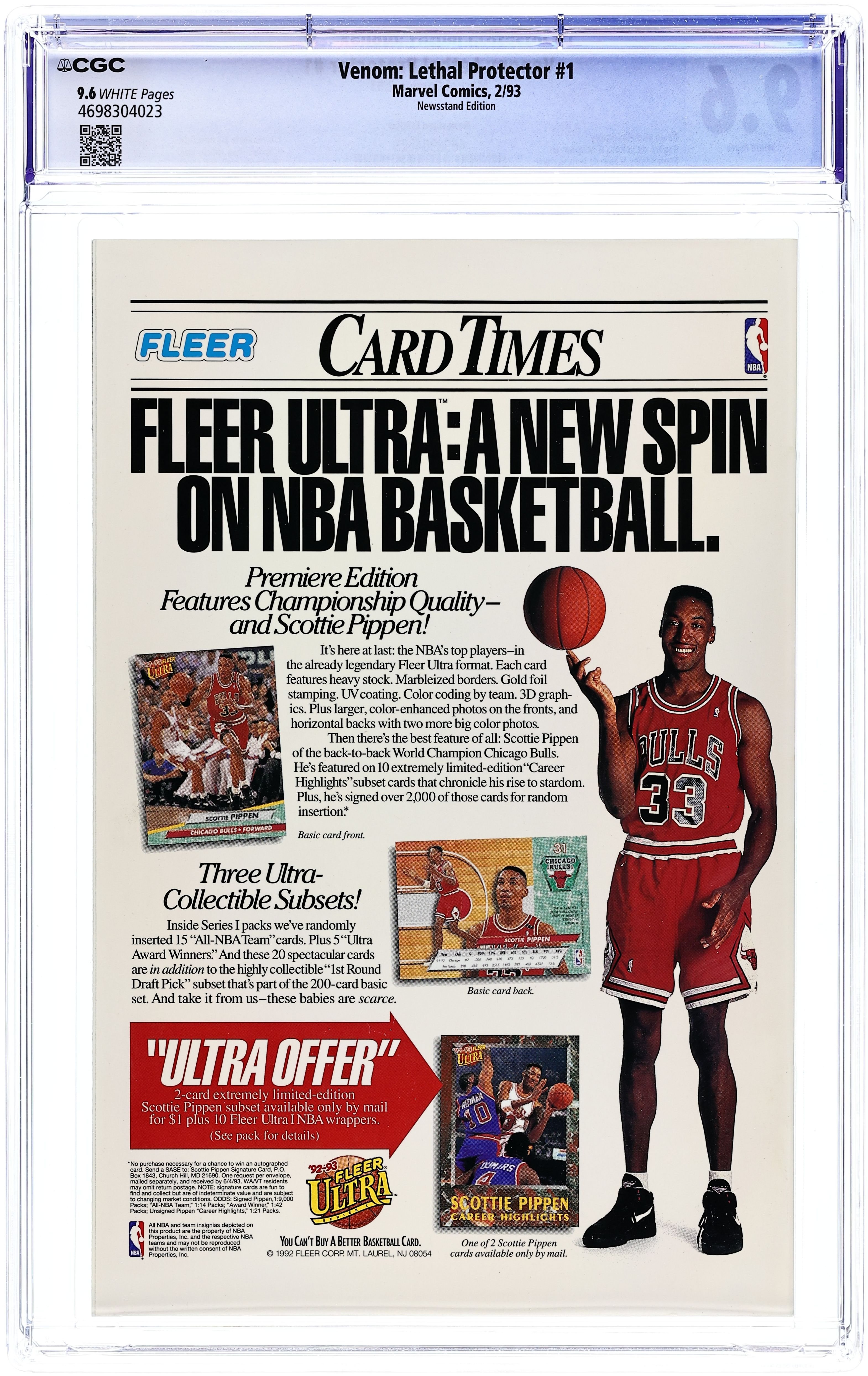 Newsstand Edition. Red Foil Enhanced CardStock cover, art by Mark Bagley and Sam de la Rosa. Lethal Protector Part 1: Dark Soul Drifting, script by David Michelinie, pencils by Mark Bagley, inks by Al Milgrom and Sam de la Rosa; Venom moves to San Fransisco to try out his new protection of innocents racket; Venom and Spidey save a group of homeless folk. 36 pgs., full color. $2.95. Cover price $2.95. Grade: CGC 9.6 explanation of grade Condition: Used (collectible)