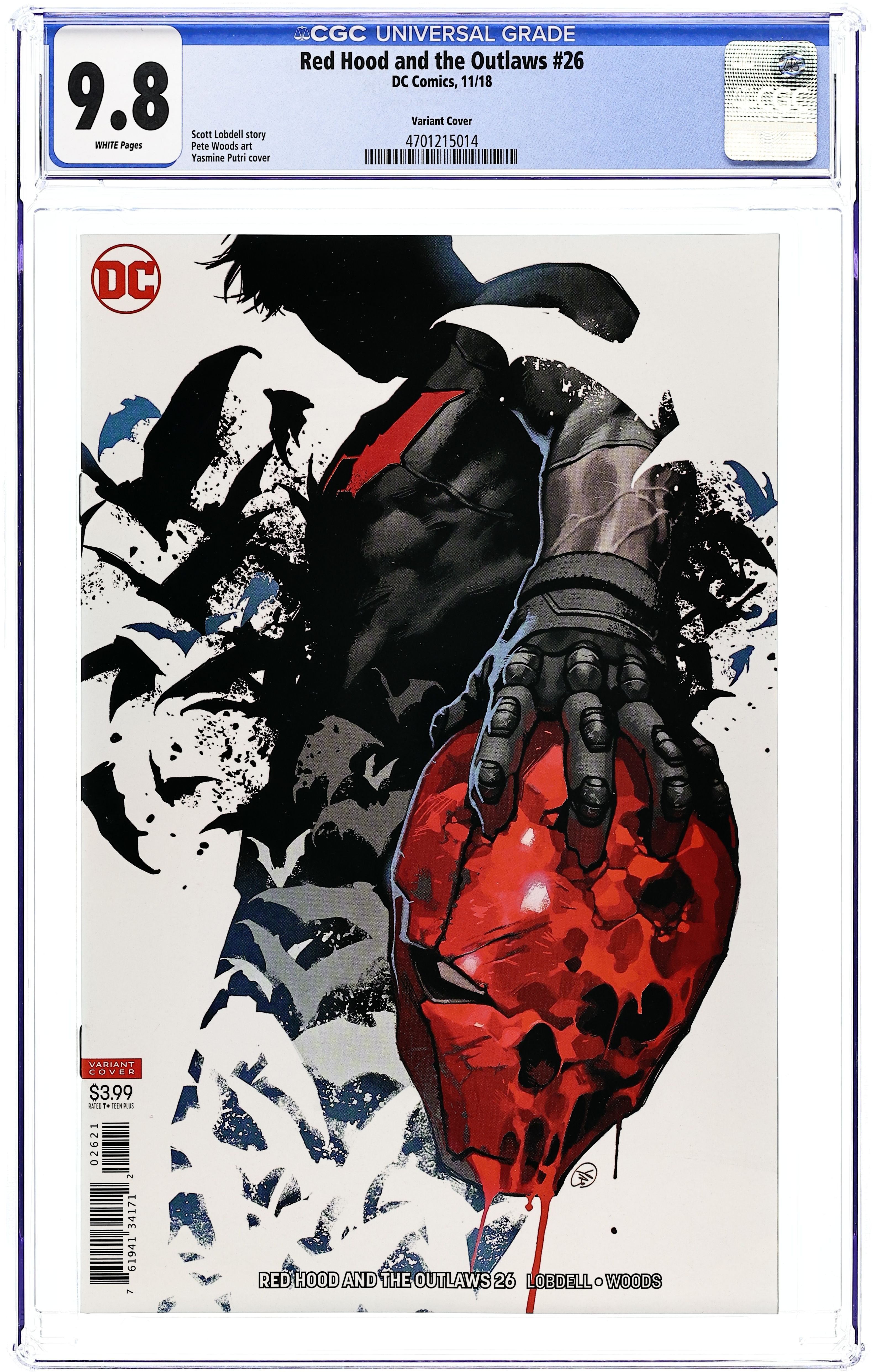 Written by Scott Lobdell. Art by Pete Woods. Cover by Yasmine Putri. Jason Todd's about to take this vigilante game to a whole new level. His partners, Bizarro and Artemis? Gone! His mentor, Batman? Out! His base of operations, Gotham City? Abandoned. Cast out and alone, Red Hood embarks on a bold, brutal new mission, with a new costume, new weapons and a new plan to punish evildoers across the DCU. Plus, Pete Woods (JUSTICE LEAGUE) joins writer Scott Lobdell as this new era begins! 32 pages, full color. Rated T+ Cover price $3.99. Grade: CGC 9.8 explanation of grade Condition: Used (collectible)