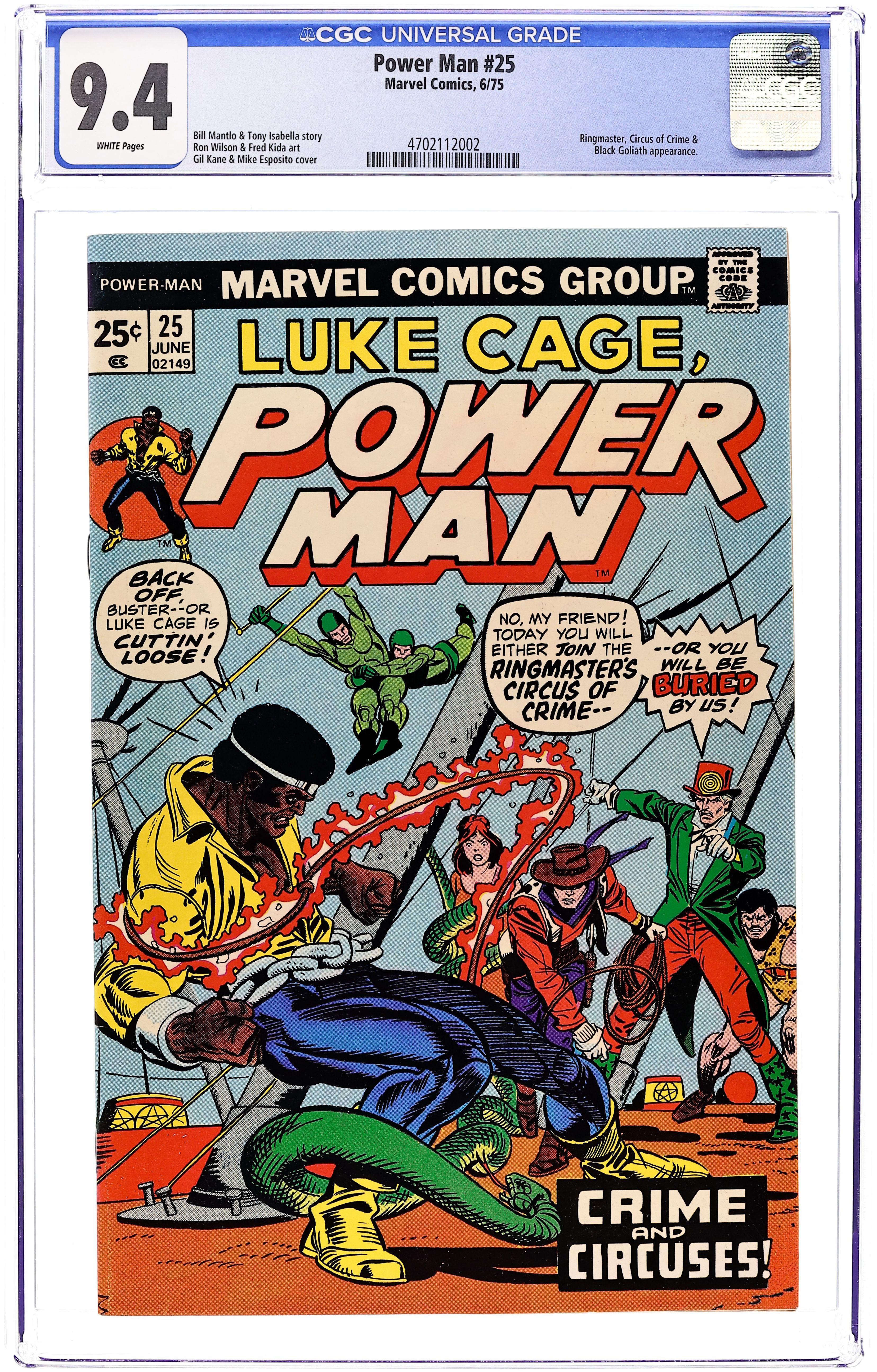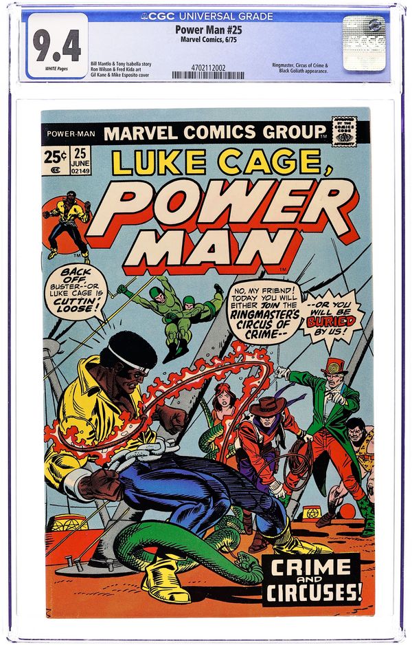 Starts Apr 27 "Crime and Circuses!" Part 2 of 2. Guest-starring Goliath (Bill Foster). Plot by Tony Isabella, script by Bill Mantlo, pencils by Ron Wilson, inks by Fred Kida. Luke Cage and Goliath must set aside their differences and confront the Ringmaster and his Circus of Crime. Spider-Man stars in a one-page Hostess ad, "The Trap." Gil Kane cover pencils. Cover price $0.25. Grade: CGC 9.4 explanation of grade Condition: Used (collectible)