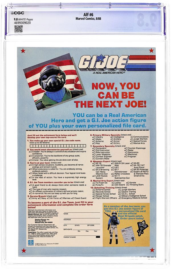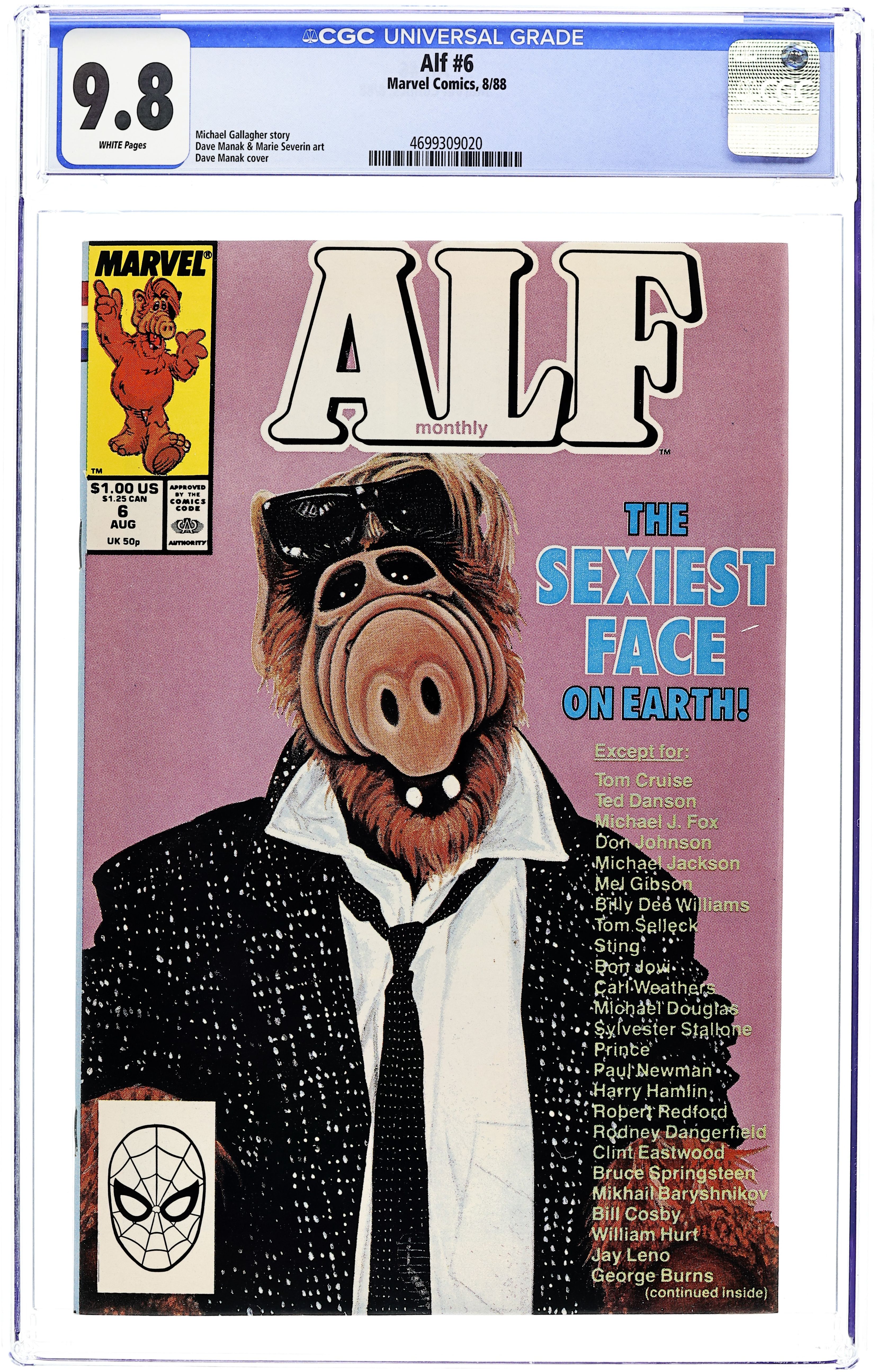 Starts Apr 4 Comic book version of the TV sitcom and cartoon that aired on NBC from 1986 to 1990 featuring an Alien Life Form (ALF) living with a family. Willie's former school, California Central, needs a new mascot for their sports events. And ALF is happy to volunteer in "Be of Good Cheer." Then ALF tells Willie and Kate about the terrible things that happened when his family on Melmac won a lottery in "That's the Ticket." And in "Hair Today, Gone Tomorrow," ALF and the Tanners have to deal with ALF going through the Melmac shed cycle. Scripts by Michael Gallagher and art by Dave Manak & Marie Severin. Cover price $1.00. Grade: CGC 9.8 explanation of grade Condition: Used (collectible)