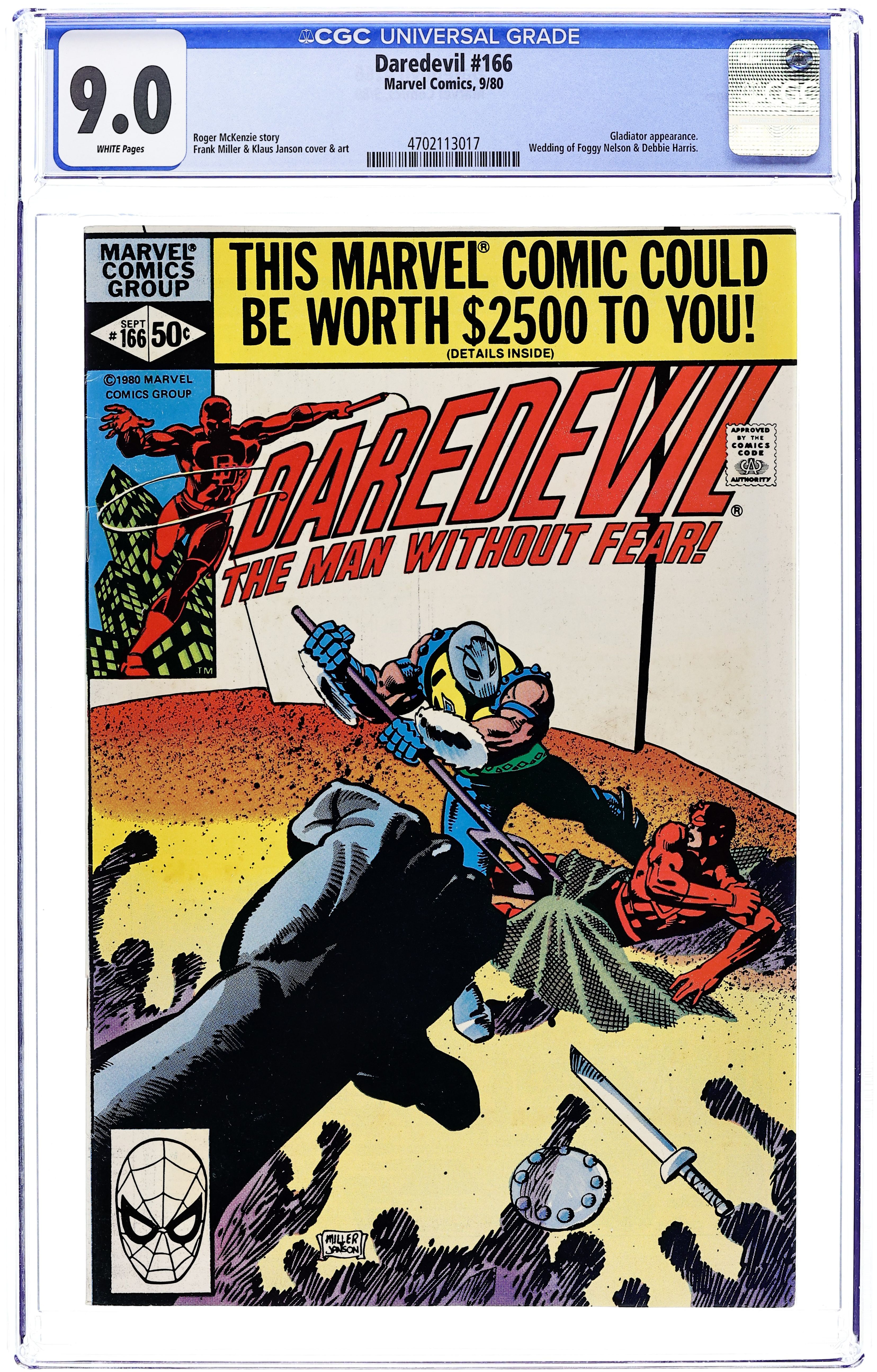Starts Apr 27 Direct Edition. First 50-cent cover price. Cover pencils by Frank Miller, inks by Klaus Janson. Till Death Do Us Part!, script by Frank Miller (plot) and Roger McKenzie (plot, script), pencils by Frank Miller, inks by Klaus Janson; the Gladiator holds a group of kids hostage in a museum, and DD has to take him down in time to make it to Foggy's wedding; cameos by the Rhino, the Scorpion, Leap-Frog, Mysterio, the Masked Marauder, the Beetle, and the Melter (as statues in a museum), plus Spock (as a wall poster). Next issue teaser is for Daredevil and The Punisher, which got pushed back to #183 due to Comic Code complications as the story involved drugs. 36 pgs. Cover price $0.50. Cover price $0.50. Grade: CGC 9.0 explanation of grade Condition: Used (collectible)
