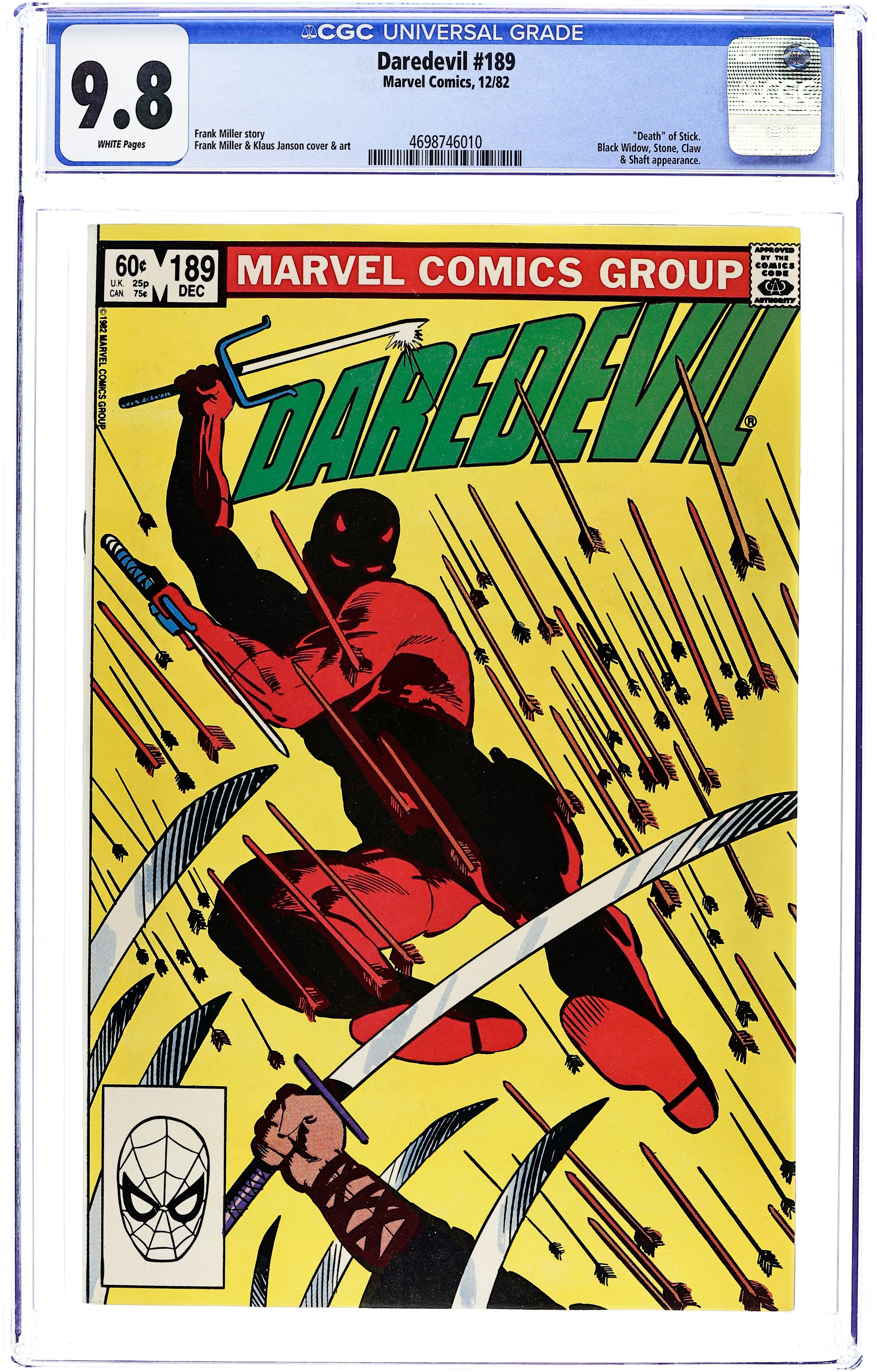 Direct Edition. Cover pencils by Frank Miller, inks by Klaus Janson. Siege, script by Frank Miller, pencils by Frank Miller (layouts) and Klaus Janson (finished art), inks by Klaus Janson; The Black Widow dies but is resurrected by Stone; DD and company have a free for all with the Hand in which Stick gives his life to save Matt; Widow and Foggy break up Heather and Matt; Stone tells DD that the Hand plans on resurrecting Elektra. Promo for next issue with Elektra replaces letters page, art by Miller. 36 pgs. Cover price $0.60. Cover price $0.60. Grade: CGC 9.8 explanation of grade Condition: Used (collectible)