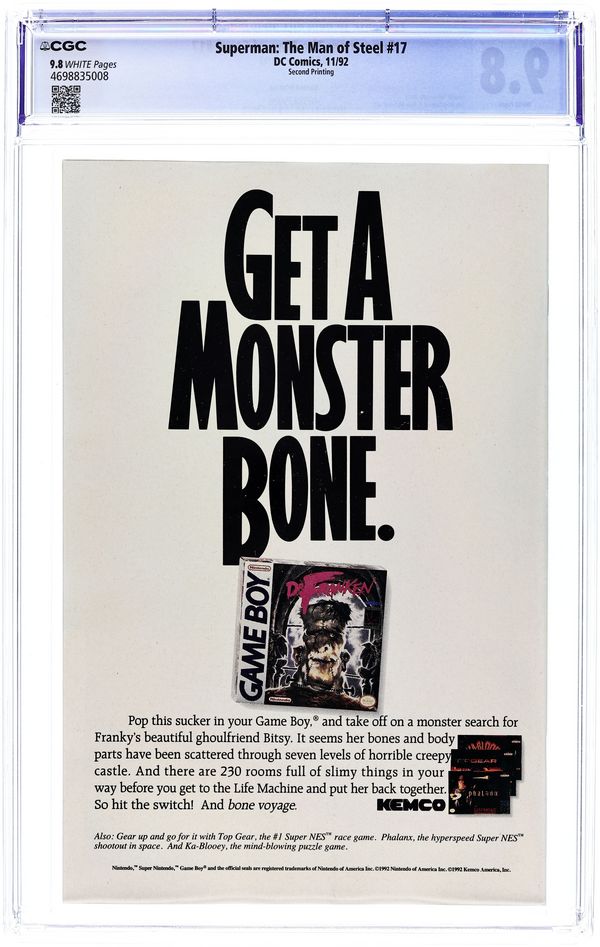 Not even Superman may be able to rescue the orphaned Keith, who's uncovered the amazing secret of the subterranean denizens of Metropolis's underworld. Also: Doomsday is coming...a first glimpse at a new character who will have a chilling effect on the life of Superman! Written by Louise Simonson, with art by Jon Bogdanove and Bob McLeod. Cover by Bogdanove and Dennis Janke. Cover price $1.25. Grade: CGC 9.8 explanation of grade Condition: Used (collectible)