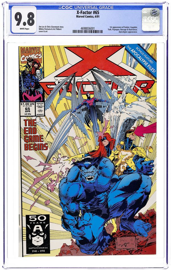 Endgame! Part 1 of 4. "Malign Influence!" Story by Whilce Portacio, Jim Lee, and Chris Claremont. Art by Whilce Portacio and Art Thibert. Apocalypse makes his final move for world domination. He sends his enforcers, the Riders of the Storm, to take out the only ones with a shot at stopping him - X-Factor. Includes the bonus feature: The Apocalypse Files. This issue - dossiers on Archangel, Cyclops, and Jean Grey written by Apocalypse himself. Cover price $1.00. Grade: CGC 9.8 explanation of grade Condition: Used (collectible)