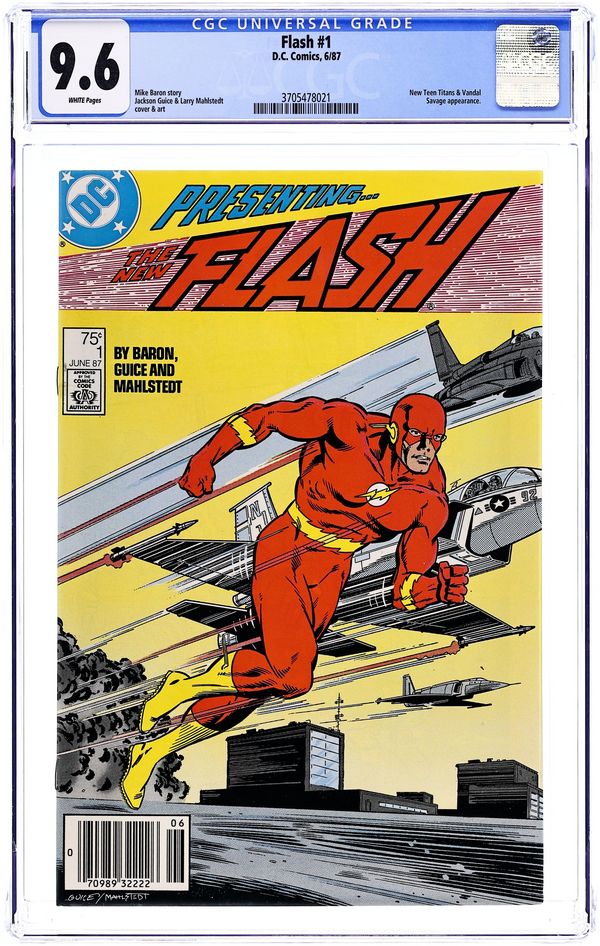Newsstand Edition. On his way to deliver a heart for transplant, Wally West comes across Vandal Savage. Part 1 of 2, continued next issue. Script by Mike Baron, pencils by Jackson Guice, inks by Larry Mahlstedt. Teen Titans cameo. Guice/Mahlstedt cover. Cover price $0.75. Grade: CGC 9.6 explanation of grade Condition: Used (collectible)