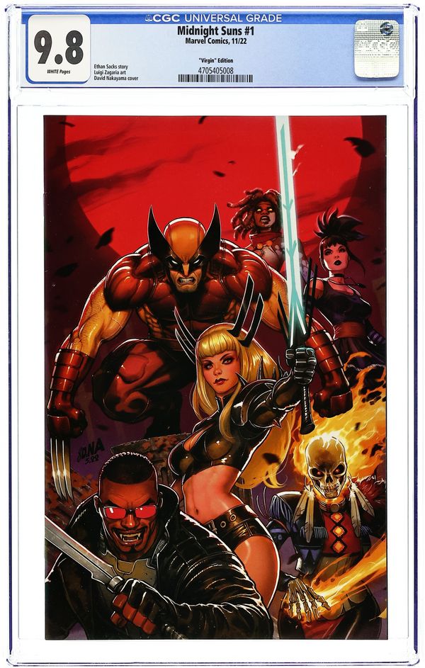 Comics Illuminati (Unknown Comic Books, Street Level Hero, Comic Traders, Frankies' Comics, and The 616 Comics) Exclusive Virgin Cover by David Nakayama. Written by Ethan Sacks. Art by Luigi Zagaria. RISE OF THE MIDNIGHT SUNS! A dark prophesy and apocalyptic new villains with horrifying powers the likes of which Earth has never faced before ordains a team of MIDNIGHT SUNS to rise and tear @#$% up: MAGIK, WOLVERINE, BLADE, SPIRIT RIDER & NICO MINORU. But what does this new threat have to do with the Sorcerer Supreme's past? And why is STRANGE ACADEMY student ZOE LAVEAU number one on the Suns' list? 32 pages, full color. Rated T+ Grade: CGC 9.8 explanation of grade Condition: Used (collectible)