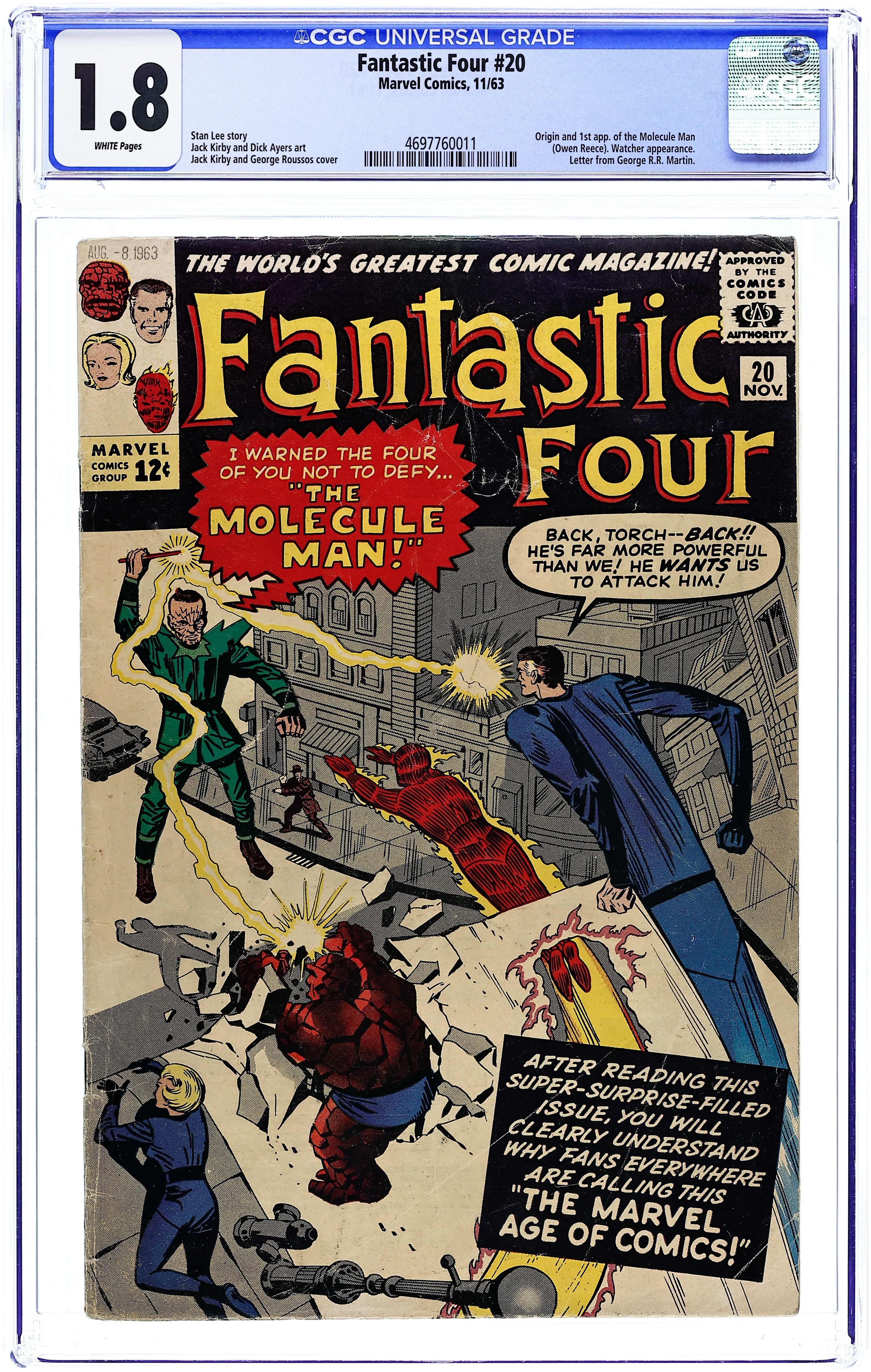 Starts Apr 27 Cover pencils by Jack Kirby, inks by George Roussos. Origin and first appearance of the Molecule Man in "The Mysterious Molecule Man!", script by Stan Lee, pencils by Jack Kirby, inks by Dick Ayers; The Watcher asks the Fantastic Four to stop a new menace who could destroy the whole universe: the Molecule Man. House ad for Tales To Astonish #49, art by Don Heck. The letters page contains a letter to the editor from George R. R. Martin, best known for the series 'A Song of Ice and Fire,' which HBO's 'A Game of Thrones' is based on (his first time published in print!), as well as a letter from then 10-year-old Mark Gruenwald, who identifies himself as the secretary of the Fantastic Four Fan Club (the Oshkosh contingent, anyway). Cover price $0.12. Grade: CGC 1.8 explanation of grade Condition: Used (collectible)