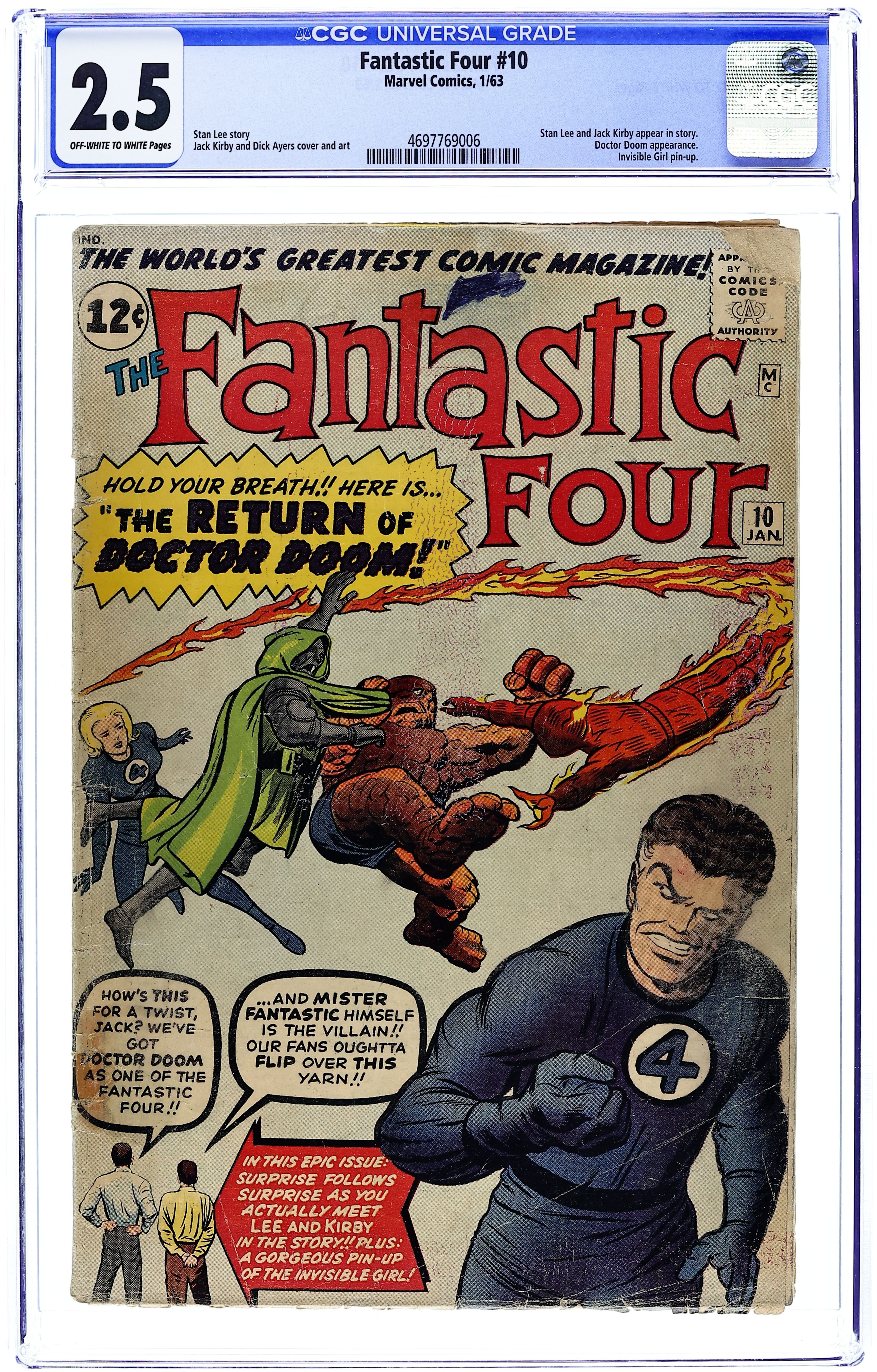 Starts Apr 4 Cover pencils by Jack Kirby, inks by Dick Ayers. Doctor Doom returns in the appropriately-named "The Return of Doctor Doom!", script by Stan Lee, pencils by Jack Kirby, inks by Dick Ayers; Doctor Doom returns from his unwanted journey in space and visits Jack Kirby and Stan Lee in order to make them set a trap for the Fantastic Four. The Invisible Girl pinup by Kirby and Ayers. Part 2 "Back from the Dead!"; Doctor Doom tells how he managed to return to Earth with the help of the Ovoids and then he changes bodies with Mr. Fantastic using Ovoid technology. Part 3 "The End of Mr. Fantastic?"; Doctor Doom convinces the rest of the Fantastic Four that he is Mr Fantastic. Part 4 "No Place to Turn!"; Doctor Doom (as Mr. Fantastic) displays his new shrinking-ray and Mr. Fantastic (in Doom's body) escapes his captivity in Doom's castle. Part 5 "The Real Doctor Doom!" Cameos by the Mole Man, the Miracle Man, the Skrulls, the Sub-Mariner, the Ant-Man, the Hulk, and Thor. Letter to the editor from Rocket's Blast editor G.B. Love. 36 pgs. $0.12. Cover price $0.12. Grade: CGC 2.5 explanation of grade Condition: Used (collectible)