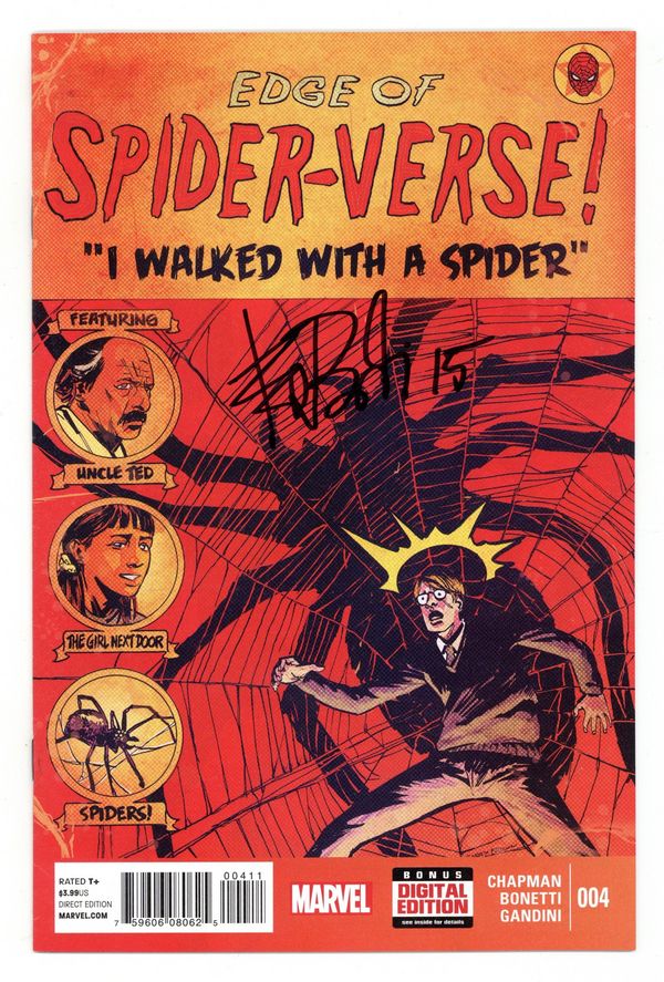 Starts May 4 Edge of Spider-Verse: Part 6 of 10 - Written by Clay Chapman. Art by Elia Bonetti. Cover by Garry Brown. A radioactive spider bites a high school nerd who is already something of a monster. Cover price $3.99. Grade: NM- 9.2 explanation of grade Condition: Used (collectible)