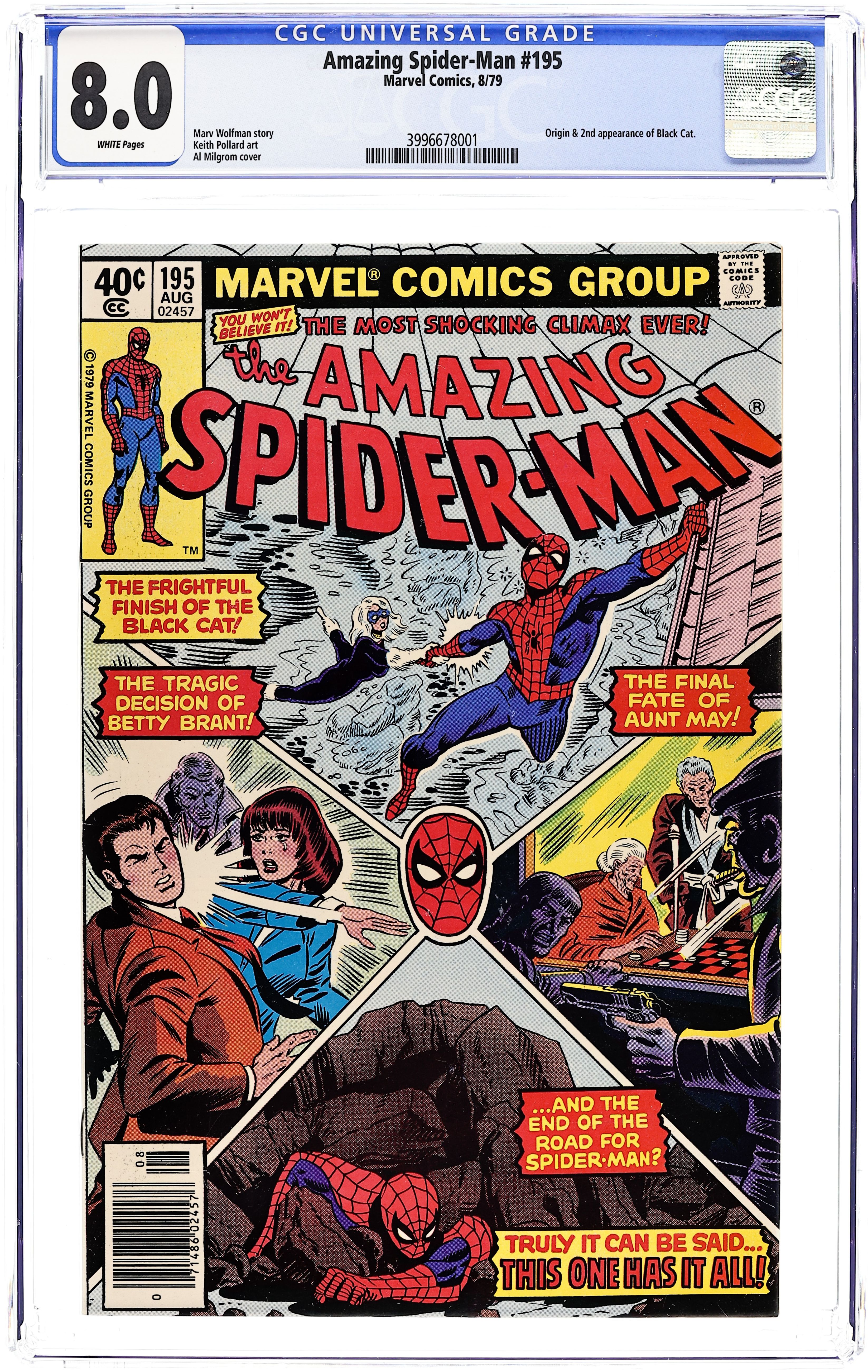 Newsstand Edition. "Nine Lives of the Black Cat!" Part 2 of 2. Second appearance of the Black Cat. Script by Marv Wolfman. Art by Keith Pollard (breakdowns) and many hands (finishes). Cover by Keith Pollard and Al Milgrom. The Black Cat successfully breaks her father out of prison! And leaves the Spectacular Spider-Man lying in the rubble with a broken arm! What a stroke of bad luck for the web-slinger! However the wondrous wall-crawler is undeterred! And despite his wounded wing, the amazing one tracks down the mischievous cat several hours later! Will Spidey and Felicia end their game of cat & mouse on a friendly note...or a fatal one? Meanwhile, a telegram arrives at Peter Parker's apartment...and with it devastating news for Aunt May's nephew. Brief origin of the Black Cat. Cameo appearances by the Kingpin, Aunt May, Betty Brant, Ned Leeds, Harry Osborn, Flash Thompson, Mysterio (in civilian clothes), and the burglar. (Notes: The Black Cat returns in Amazing Spider-Man 204. The letters page includes a letter from comics historian Peter Sanderson.) 36 pgs. Cover price $0.40. Grade: CGC 8.0 explanation of grade Condition: Used (collectible)