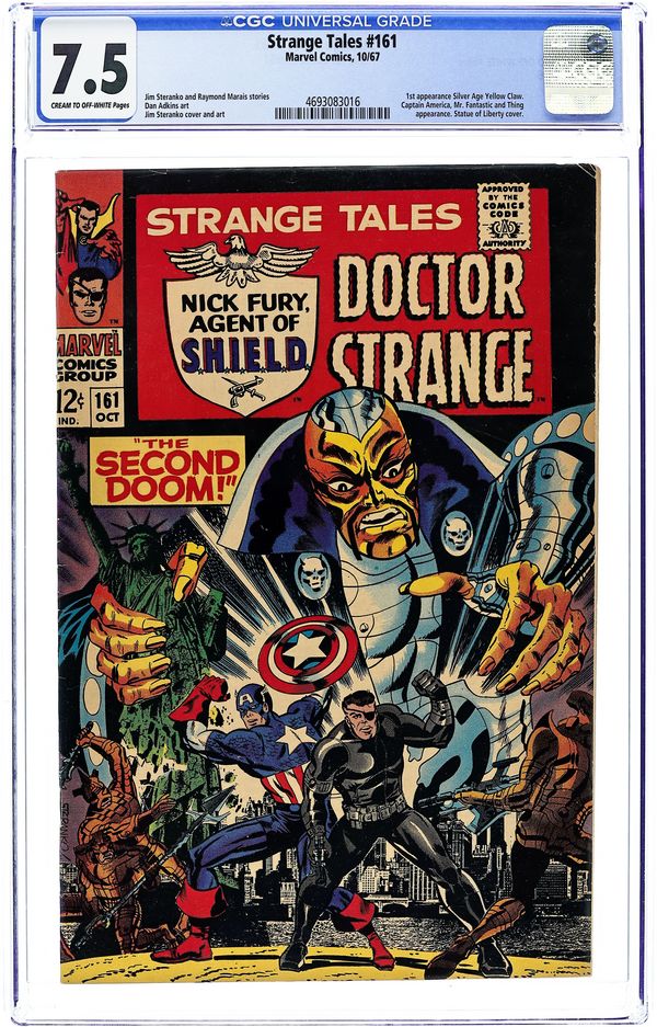 Starts Apr 27 Cover art by Jim Steranko. Captain America guest stars in the Nick Fury story "The Second Doom," script and art by Jim Steranko; Reed Richards & Ben Grimm save Cap from falling to his death while Fury saves himself by catching onto the Statue's crown; Reed and Ben provide assistance to the pair and stop the invaders plans, cutting off all power on the East Coast, creating the New York City Blackout in the process; Back in the present Jimmy Woo tells Fury he believes the man behind the scheme was The Yellow Claw; First appearance of the Yellow Claw since the fifties. "And a Scourge Shall Come Upon You!", script by Raymond Marais and Dan Adkins (co-plot), art by Dan Adkins (first interior work on the series); Mordo exiles Strange to "The World Of the Million Perils," then sets about restoring some of the magic to his new coven; Lost in a distant galaxy Strange suffers temporary memory loss and faces a nameless beast within a hollow sphere; On Earth, Victoria Bentley, freed of the evil finds herself being hurled between worlds, wondering if it's Mordo's doing; Strange hears a cry for help, and discovers Victoria being menaced by a gigantic ant; The two face Nebulos, a bizarre alien creature who claims they are part of his plan; Baron Mordo appearance. Merry Marvel Marching Society info and coupon. 36 pgs., full color. Cover price $0.12. Grade: CGC 7.5 explanation of grade Condition: Used (collectible)