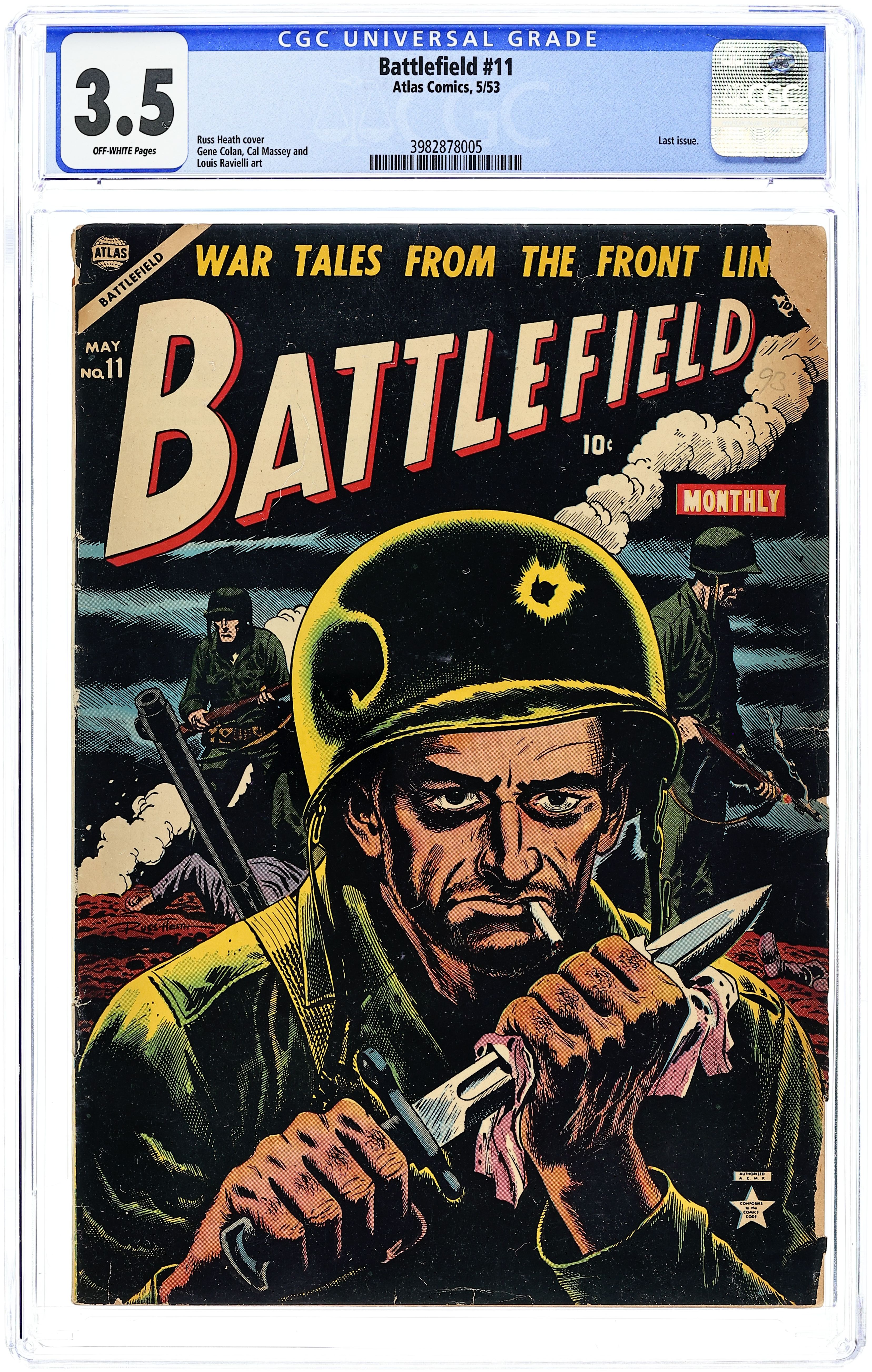 Final issue of the series. Cover by Russ Heath. "We Won't Go Back!", art by Louis Ravielli; Corporal Bob Young learns what compulsory repatriation will mean to the Chinese prisoners he is guarding. "Return To Bataan," art by Gene Colan; After escaping on the last raft out of Bataan, Slug returns two years later to free Bataan. "The General Goes To War" two-page text story. "Pep Talk!"; Chinese recruits are told that they are invincible but they learn a brutal lesson when they get to the front. "Attack At Midnight," art by Cal Massey; A raw recruit learns he is not alone on the battlefield. 36 pgs., full color. Cover price $0.10. Grade: CGC 3.5 explanation of grade Condition: Used (collectible)