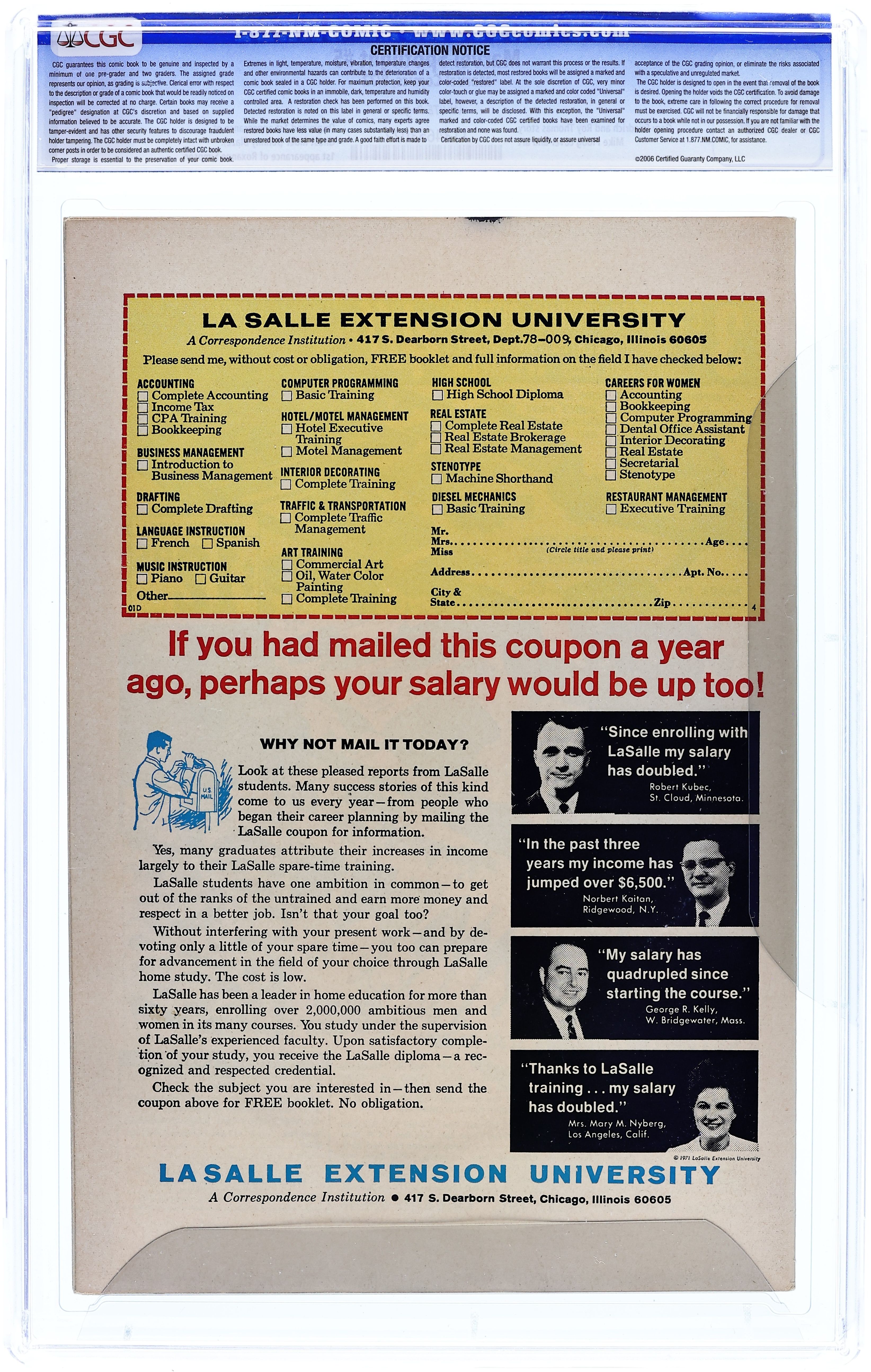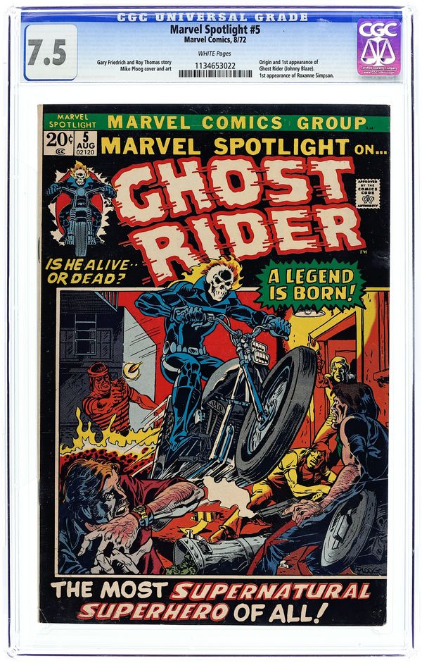 Origin and first appearance of the Ghost Rider. First appearance of Roxanne Simpson. Cover art by Mike Ploog. Origin of the Ghost Rider, script by Roy Thomas and Gary Friedrich, art by Mike Ploog; To save the life of his mentor and the man who has become like a father to him, Johnny Blaze makes a deal with the devil and is transformed into the spirit of vengeance, Ghost Rider. 36 pages, full color. Cover price $0.20. Grade: CGC 7.5 explanation of grade Condition: Used (collectible)