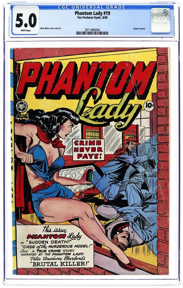 Cover art by Matt Baker. Wine, Women, and Sudden Death starring Phantom Lady, art by Matt Baker. Case of the Murderous Model starring Phantom Lady, script by Gregory Page, art by Matt Baker. Peter Treadway, Cleveland's Brutal Killer. The Crime Goddess text story. 36 pgs. $0.10. Cover price $0.10. Grade: CGC 5.0 explanation of grade Condition: Used (collectible)