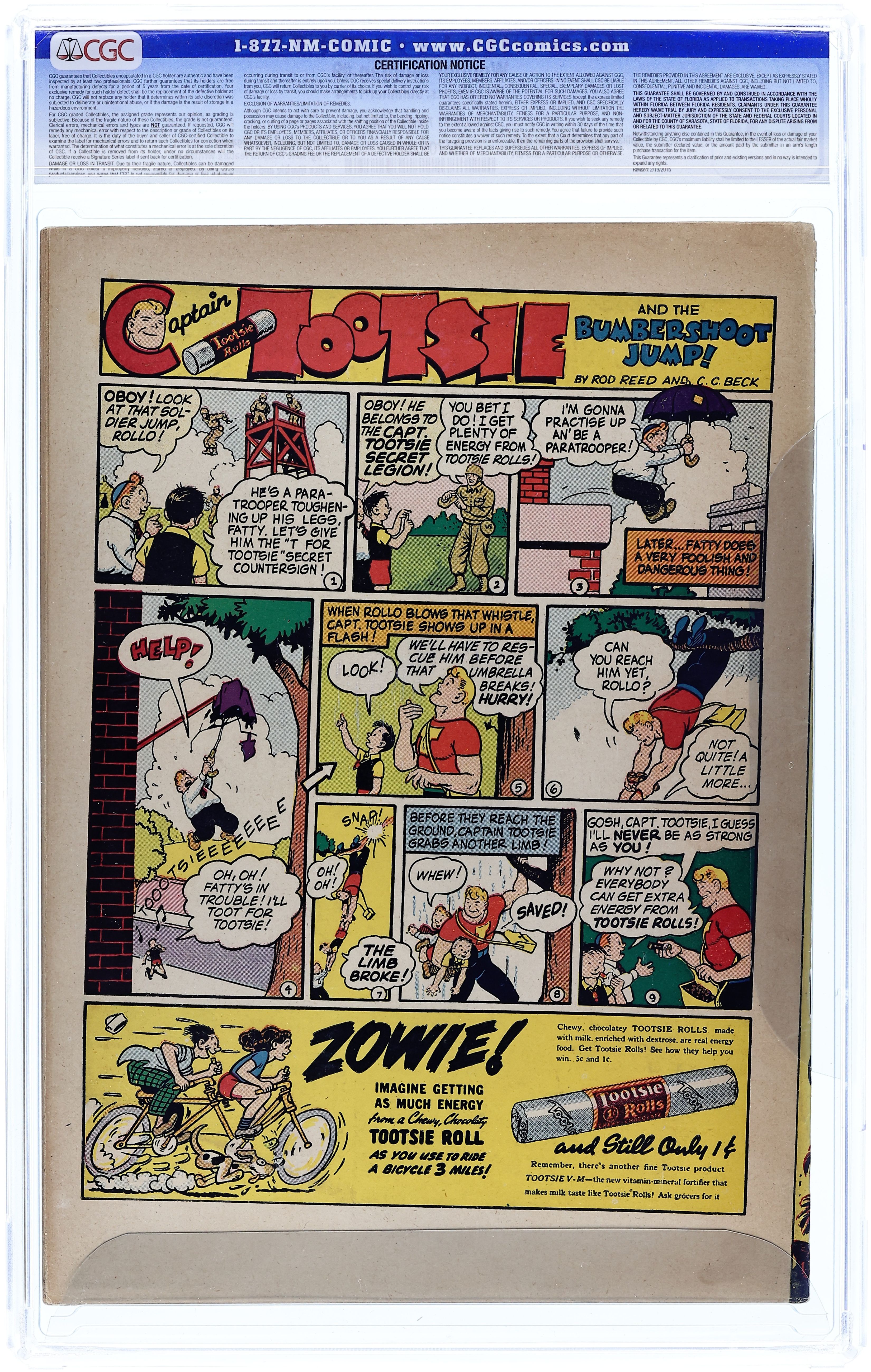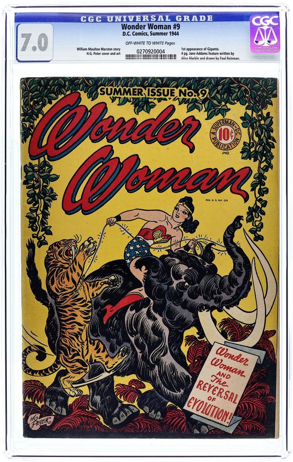 Cover by Harry G. Peter. "Evolution Goes Haywire," script by William Moulton Marston (as Charles Moulton), art by Harry G. Peter; When Steve Trevor's niece is kidnapped by a gorilla, Wonder Woman captures the Gorilla and turns her over to Professor Zool, who uses his evolution machine to turn her human. "The Freed Captive," script by William Moulton Marston (as Charles Moulton), art by Harry G. Peter; Professor Zool's machine advances everyone to the Golden Age of Greece, but Giganta introduces evil and brings the Golden Age to an end. "Death Stalks the Convoy" text story starring Hop Harrigan / text story. Untitled story, script by William Moulton Marston (as Charles Moulton), art by Harry G. Peter; The Evolution machine brings them to Amazonia before Diana was born. Back cover Tootsie Roll ad, "Captain Tootsie and the Secret Weapon" by Rod Reed and C.C. Beck. 52 Pages, Full Color. Cover price $0.10. Grade: CGC 7.0 explanation of grade Condition: Used (collectible)