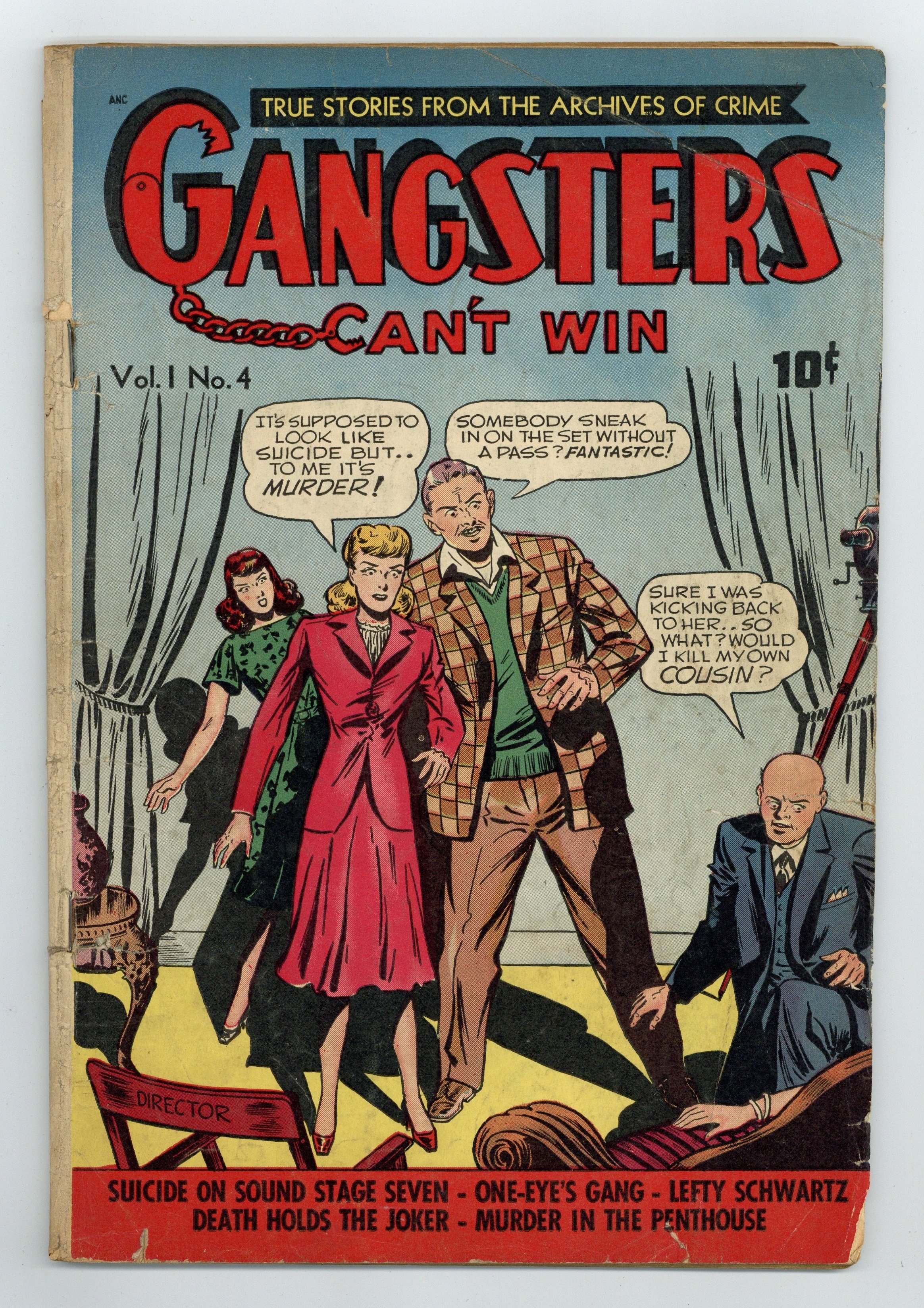 Starts Apr 27 Stories and art by Tex Blaisdell and others. Starting as a brutal pre-Code true-crime comic in its early issues, Gangsters Cant Win later evolved into a standard mystery-detective title. Lefty Schwartz is done in by his own cronies when the heat gets too hot, in a story inspired by real-life gangster Dutch Schultz. No one suspects that a quiet, suburban family man leads a secret life as a bank robber. In 1945, a gangster targets a profitable bookie joint in Chicago. Suicide on Sound Stage Seven; Mystery of the Murder in the Penthouse; Lefty Schwartz; The Ghost of Mrs. Hicks; One Eye's Gang; Death Holds the Joker; Frankie the Pug. 52 pages, Full Color. Cover price $0.10. Grade: PR 0.5 explanation of grade Condition: Used (collectible)