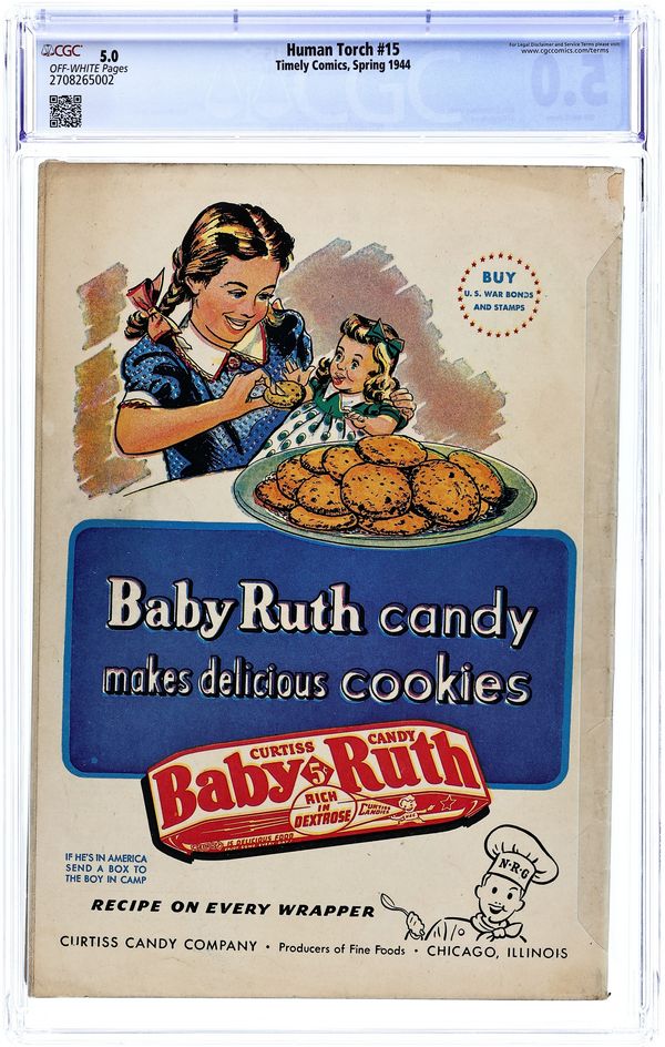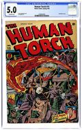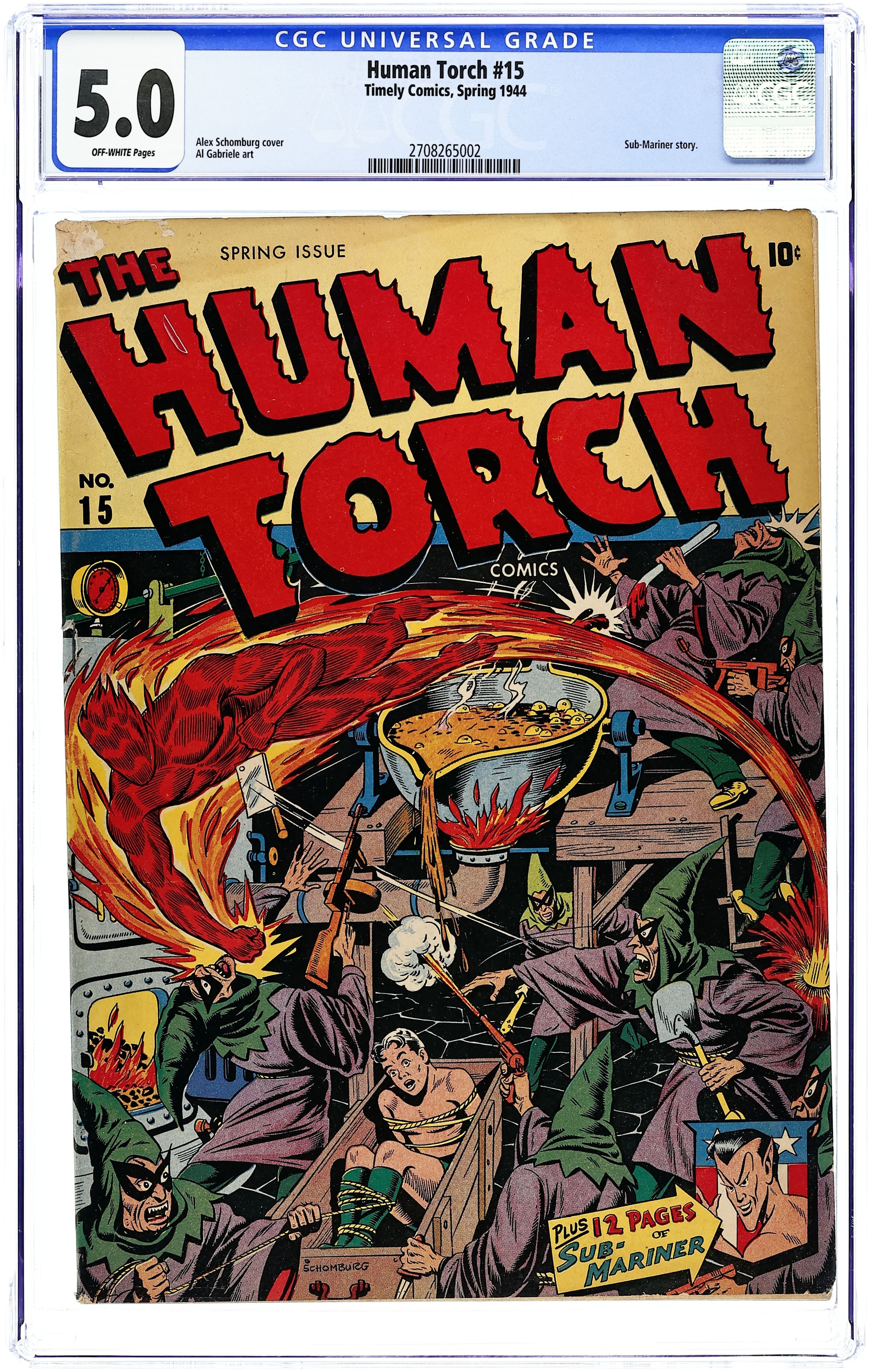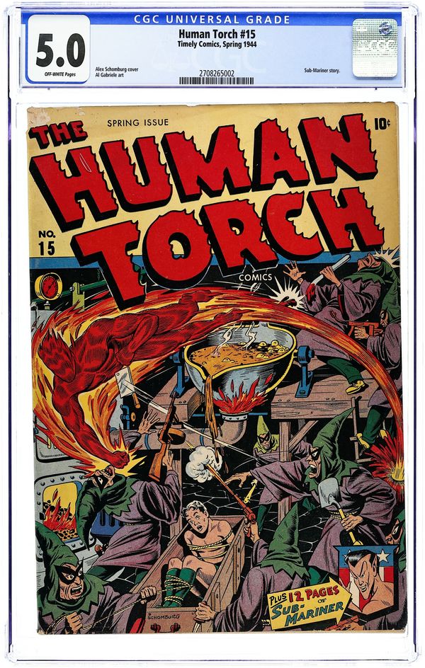 Cover art by Alex Schomburg. Big Brain starring the Human Torch, art by Al Gabriele; Hitler orders his special agent The Brain, who is a senator turned traitor, to begin a campaign of sabotage; He falls to his death in battle with Torch and Toro at an industrial plant he had hoped to destroy. Nazi Poison Fiend starring the Human Torch. Testing Ground text story. The Dog Tag Horror starring the Human Torch, pencils by Al Gabriele. Yellow Fang's Unholy Mission starring the Sub-Mariner. $0.10. Cover price $0.10. Grade: CGC 5.0 explanation of grade Condition: Used (collectible)