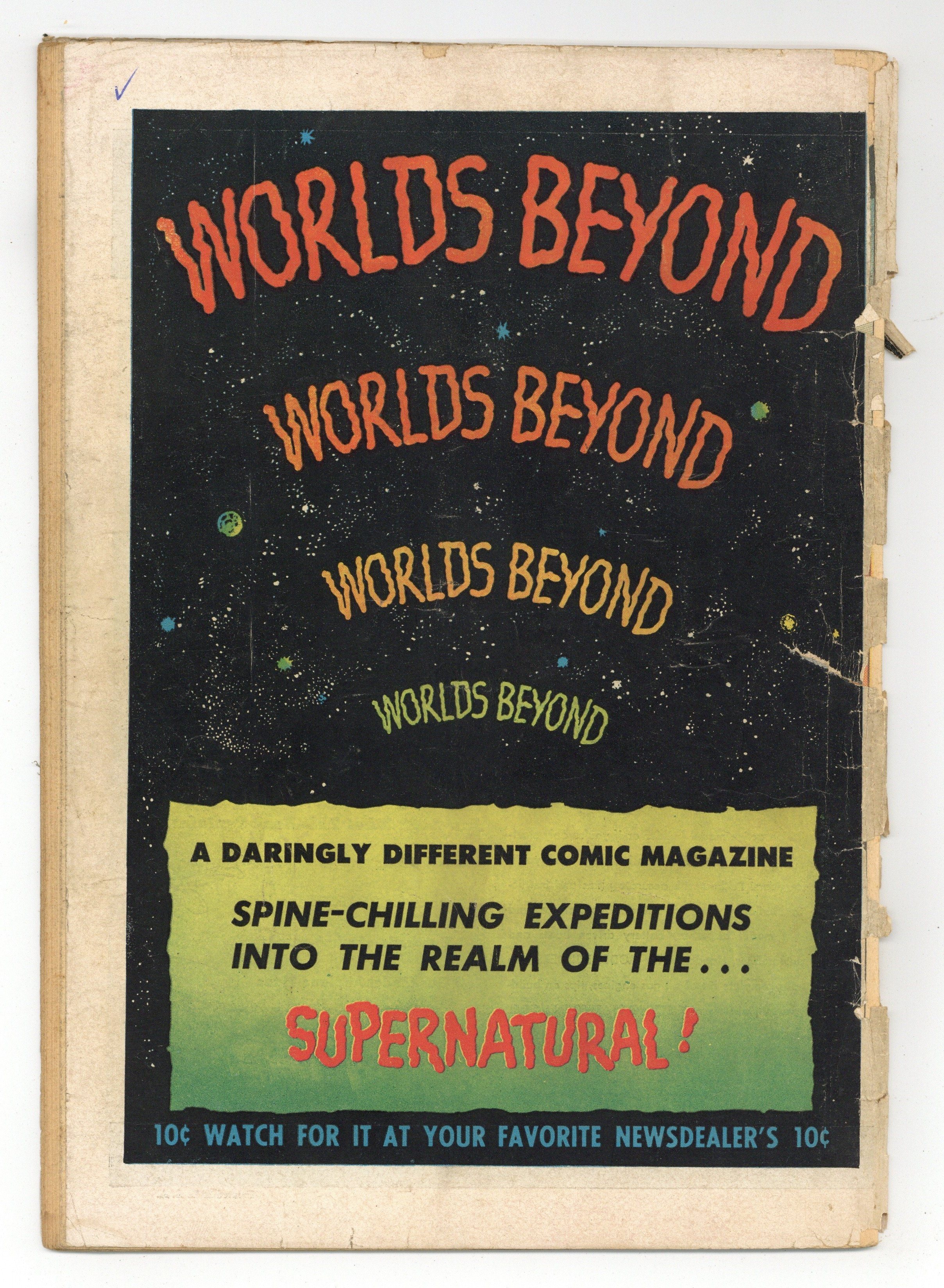 Ends Apr 13 9:40 PM CST Bid History no bids Minimum Bid $1 Your Secret Max Bid If you'd like to bid, please log in or register. Edited by Will Lieberson, Roy Ald and Al Jetter. Cover by Shelly Moldoff. Stories by unknown. Art by George Evans, Bernard Baily and Shelly Moldoff. Horror tales that are so scary they could only lead you to believe that This Magazine is Haunted! In this issue: After two hundred years the Duke of Allister rises newly born from his casket at Carnoc Castle. Now immortal, he seeks to lead a second life. But the forces of witchcraft which granted him his gift return to haunt the Duke in "The Curse of Carnoc Castle" with art by George Evans. Plus: Karl Danner steals the coat of a dying man and uses the ticket he finds in its pockets to escape aboard a ferry. Unfortunately he has chosen the ferry of the dead and is doomed to ride along in "Stand-in for Death" with art by Bernard Baily. And: Beautiful Carlotta marries undertaker Hiram for his money. Things get dangerous when she finds out that her husband made a pact with the devil in person in "The Coffin-Maker!" with art by Shelly Moldoff. Also: 2-page text story "Doctor MacCready's Little Men" written by Al Schutzer, and an ad for Worlds Beyond. 36 Pages, Full Color. Cover price $0.10. Grade: FR 1.0 explanation of grade Condition: Used (collectible)