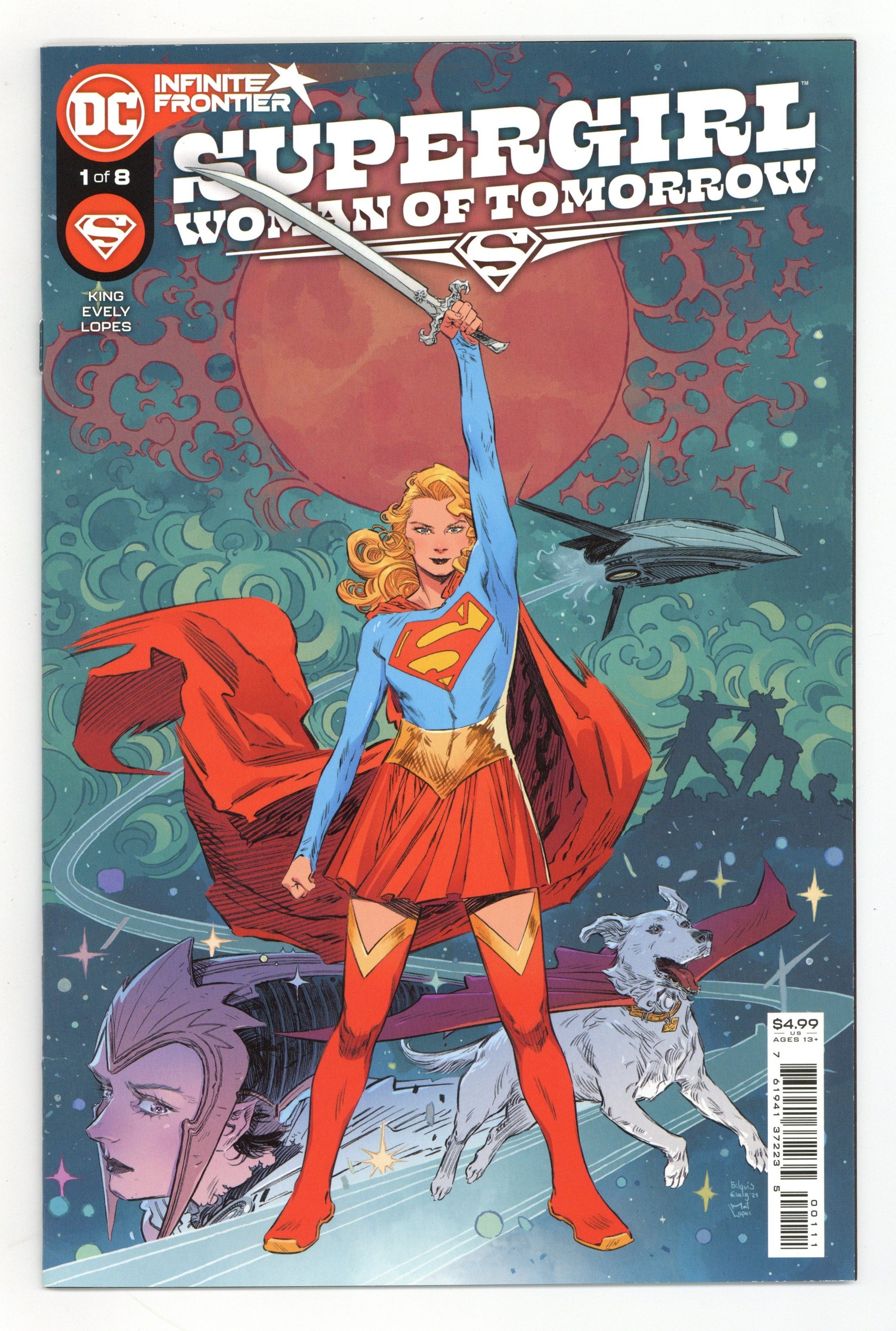 Written by Tom King. Art and Cover by Bilquis Evely. Kara Zor-El has seen some epic adventures over the years, but finds her life without meaning or purpose. Here she is, a young woman who saw her planet destroyed and was sent to Earth to protect a baby cousin who ended up not needing her. What was it all for? Wherever she goes, people only see her through the lens of Supermans fame. Just when Supergirl thinks shes had enough, everything changes. An alien girl seeks her out for a vicious mission. Her world has been destroyed, and the bad guys responsible are still out there. She wants revenge, and if Supergirl doesnt help her, shell do it herself, whatever the cost. Now a Kryptonian, a dog, and an angry, heartbroken child head out into space on a journey that will shake them to their very core. 32 pages, full color. Rated T+ Cover price $4.99. Grade: VF/NM 9.0 explanation of grade Condition: Used (collectible)