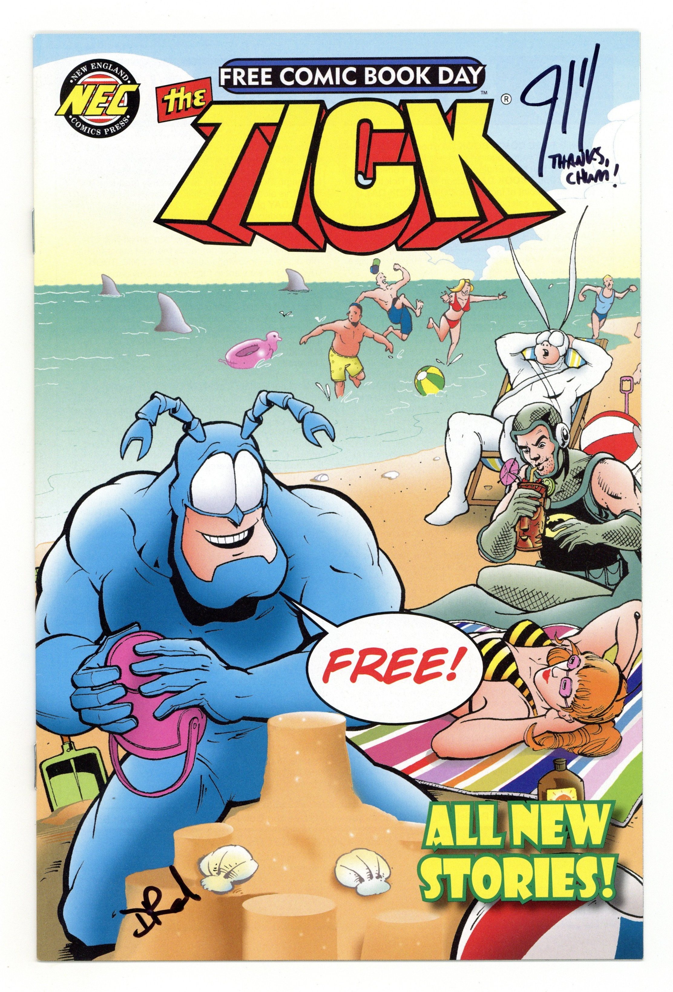 Starts May 4 (W) Jeff McClelland (A) Pietro, Duane Redhead (CA) Duane Redhead This FCBD, NEC Press offers fans---both old and new!---a FULL-COLOR 32-page comic book with an ALL-NEW FULL-LENGTH Tick story! Plus exciting all-new backup features as well. "A Day at the Beach" starts out innocently enough for The Tick, Arthur, Bumbling Bee & their friends---until The Tick encounters an invasion force from under the sea! A story sure to be enjoyed by existing Tick fans as well as suitable to introduce new readers to the world of The Tick and his cohorts! Grade: NM- 9.2 explanation of grade Condition: Used (collectible)