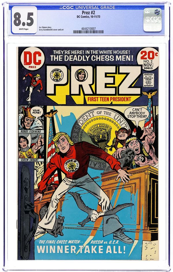 Starts May 4 "Invasion of the Chessmen." Joe Simon, the legendary creator of Captain America, imagines the first teen-aged president. Prez battles Boss Smiley, a corrupt, all-powerful political boss with the head of a smiley-face button. Must be seen to be believed. Art by Jerry Grandenetti. 36 pages. Cover price $0.20 Cover price $0.20. Grade: CGC 8.5 explanation of grade Condition: Used (collectible)