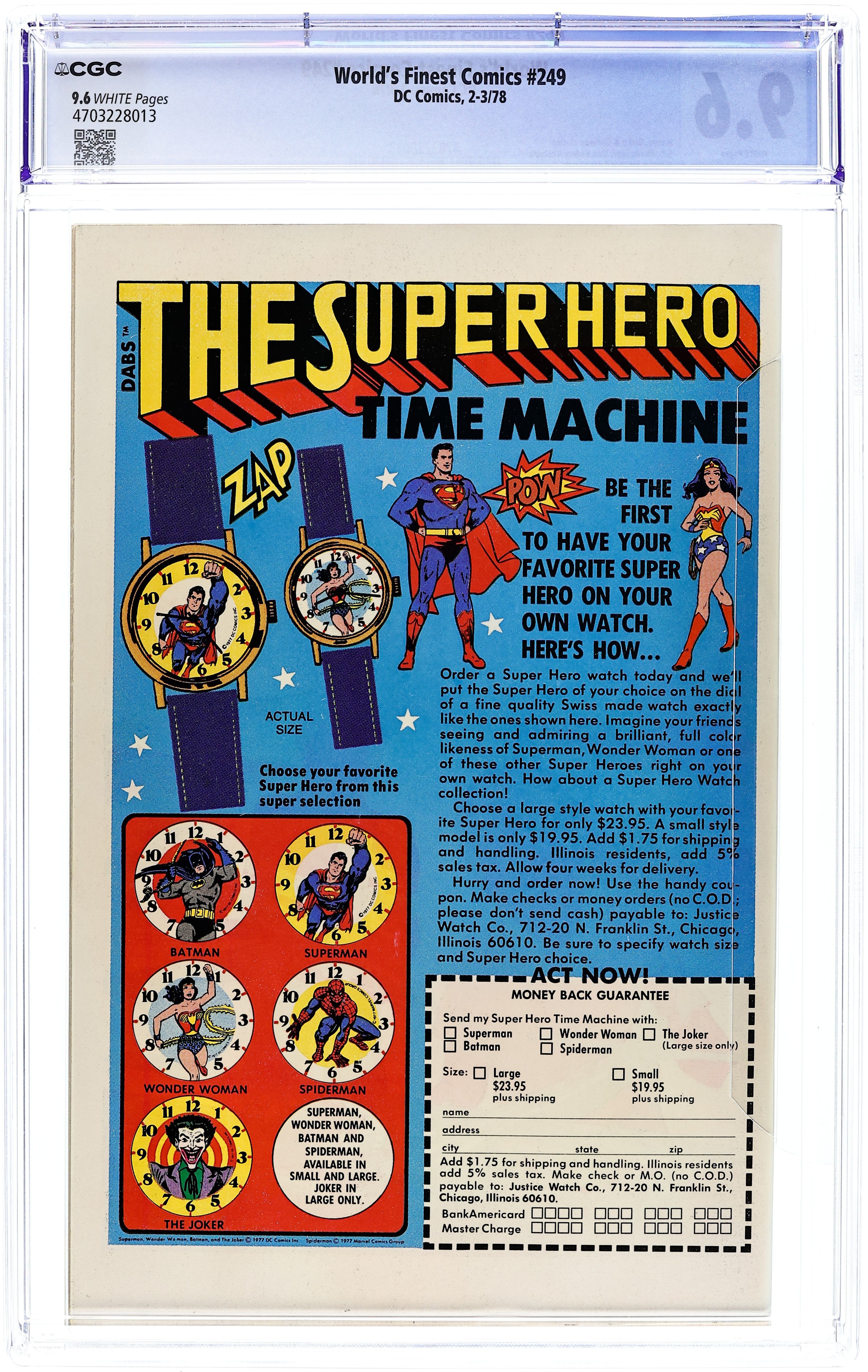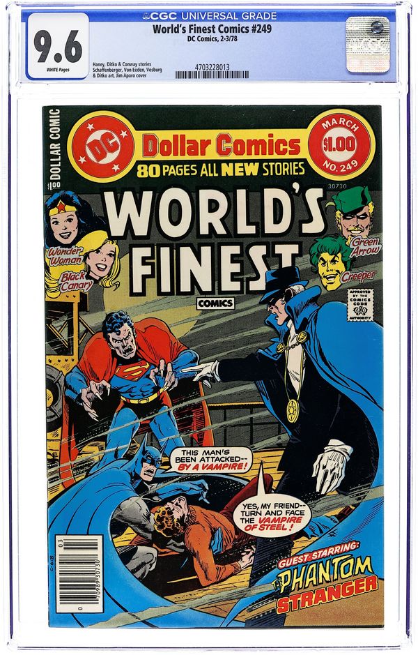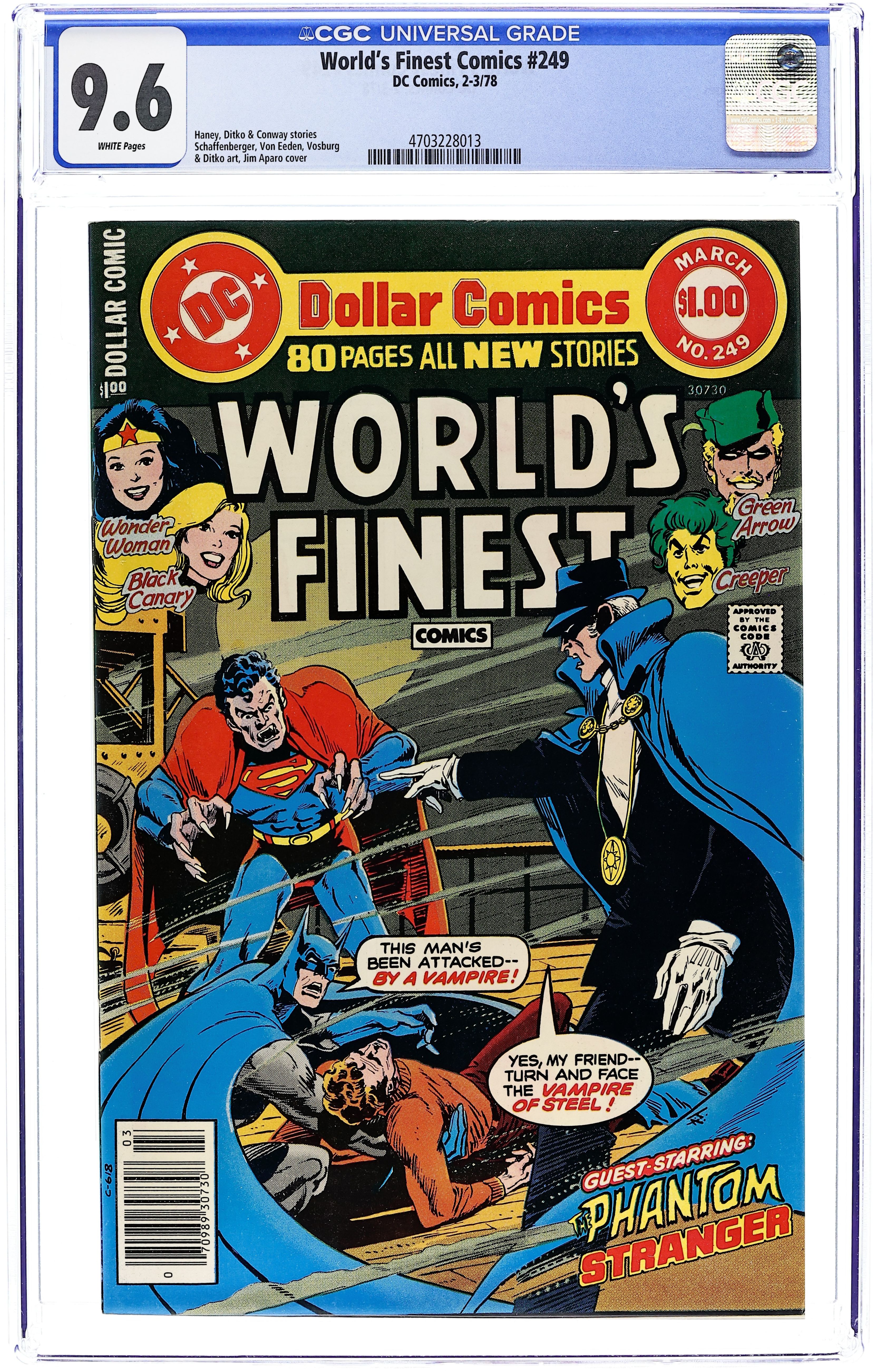 Cover art by Jim Aparo. The Vampire of Steel starring Superman and Batman, script by Bob Haney, pencils by Kurt Schaffenberger, inks by Tex Blaisdell; Superman, Batman, and the Phantom encounter marine vampires on an offshore oil rig. Will The Costume Make The Hero? starring Green Arrow, Black Canary, and Hellgrammite, script by Gerry Conway, pencils by Trevor von Eeden, inks by Vince Colletta. Moon Lady and the Monster starring The Creeper, script and art by Steve Ditko. Fire In The Sky starring Wonder Woman, script by Gerry Conway, pencils by Mike Vosburg, inks by Bob Smith. Aquaman stars in a one-page Hostess ad, Mera Meets the Manta Men. 84 Pages, Full Color. Cover price $1.00. Grade: CGC 9.6 explanation of grade Condition: Used (collectible)