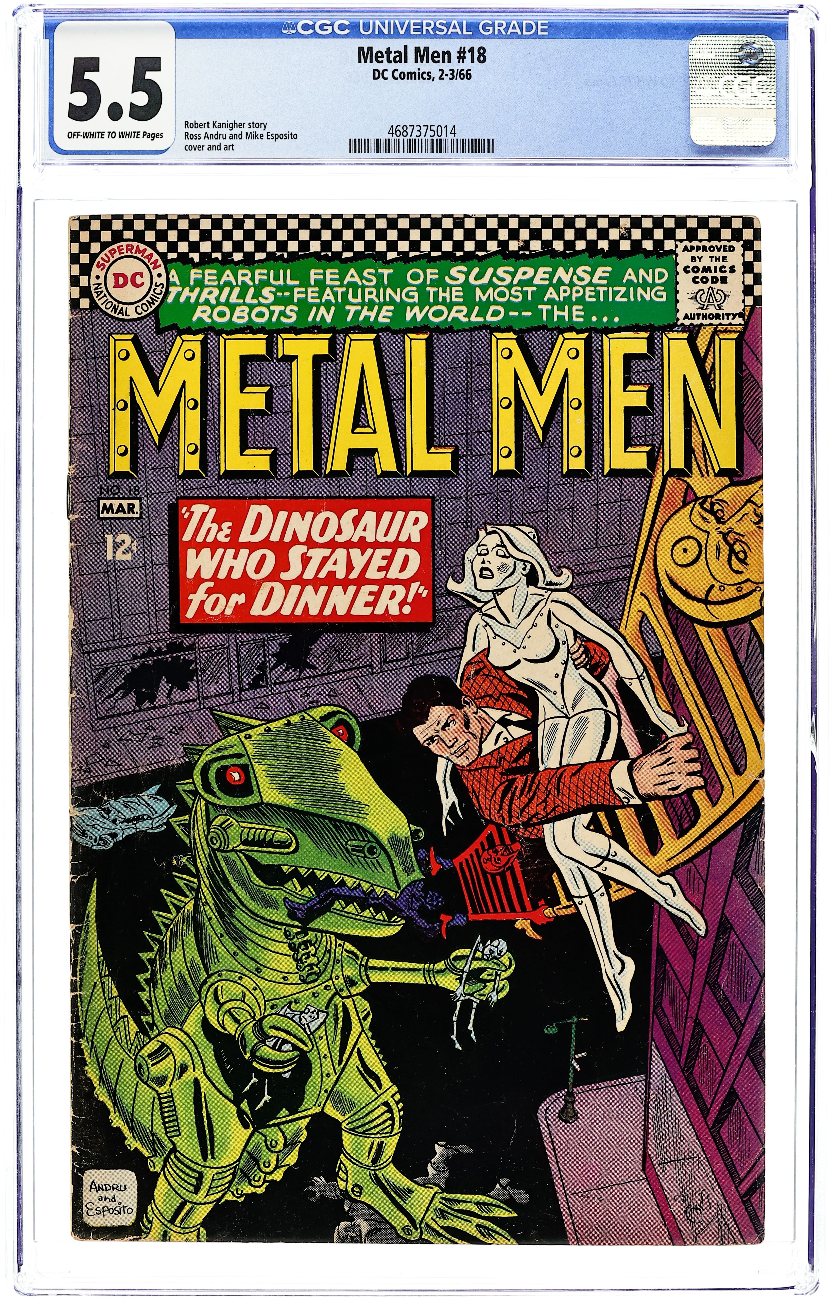 Starts May 4 Cover pencils by Ross Andru, inks by Mike Esposito. The Dinosaur Who Stayed for Dinner, script by Bob Kanigher, pencils by Ross Andru, inks by Mike Esposito; Tina befriends a robot dinosaur who they were supposed to battle; the robot dinosaur, disobeying his creator, returns the Metal Men to Earth (as opposed to deep space). 36 pgs. $0.12. Cover price $0.12. Grade: CGC 5.5 explanation of grade Condition: Used (collectible)