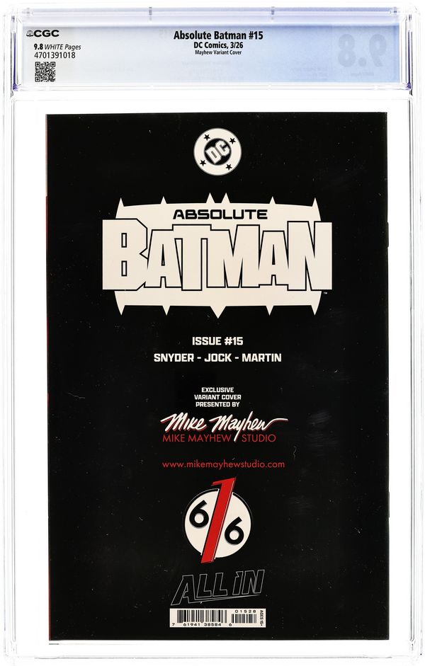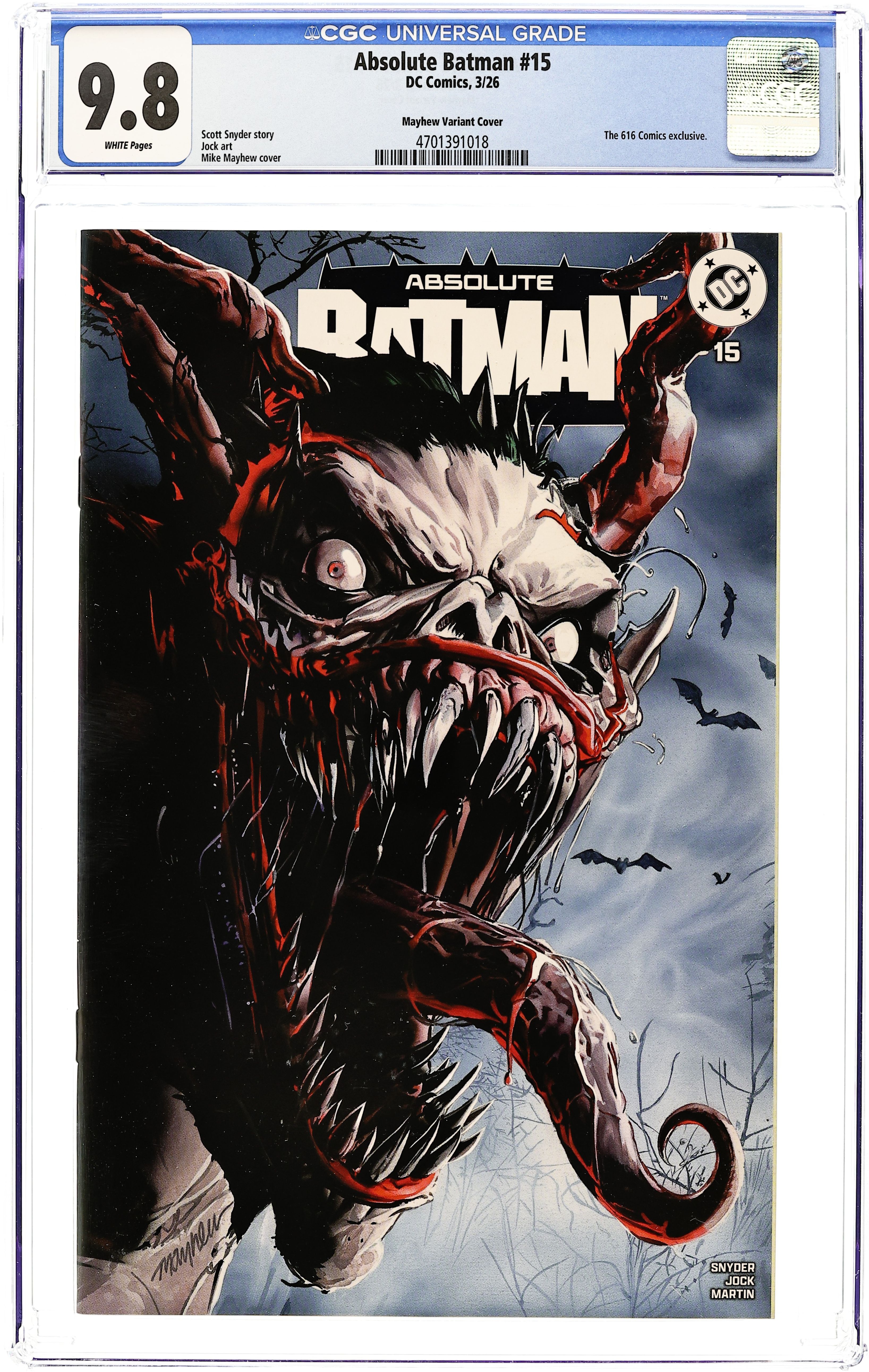 Starts May 4 The 616 Comics Exclusive Variant Cover by Mike Mayhew. Story by Scott Snyder. Art by Jock. SCOTT SNYDER REUNITES WITH LEGENDARY ARTIST JOCK! Alfred reveals to Bruce the story of the man he's been chasing for years. Enter: Joker! Scott Snyder and Jock reunite for an epic tale in the Absolute Universe! 32 pages, full color, rated 15+. Grade: CGC 9.8 explanation of grade Condition: Used (collectible) unless item is a new release