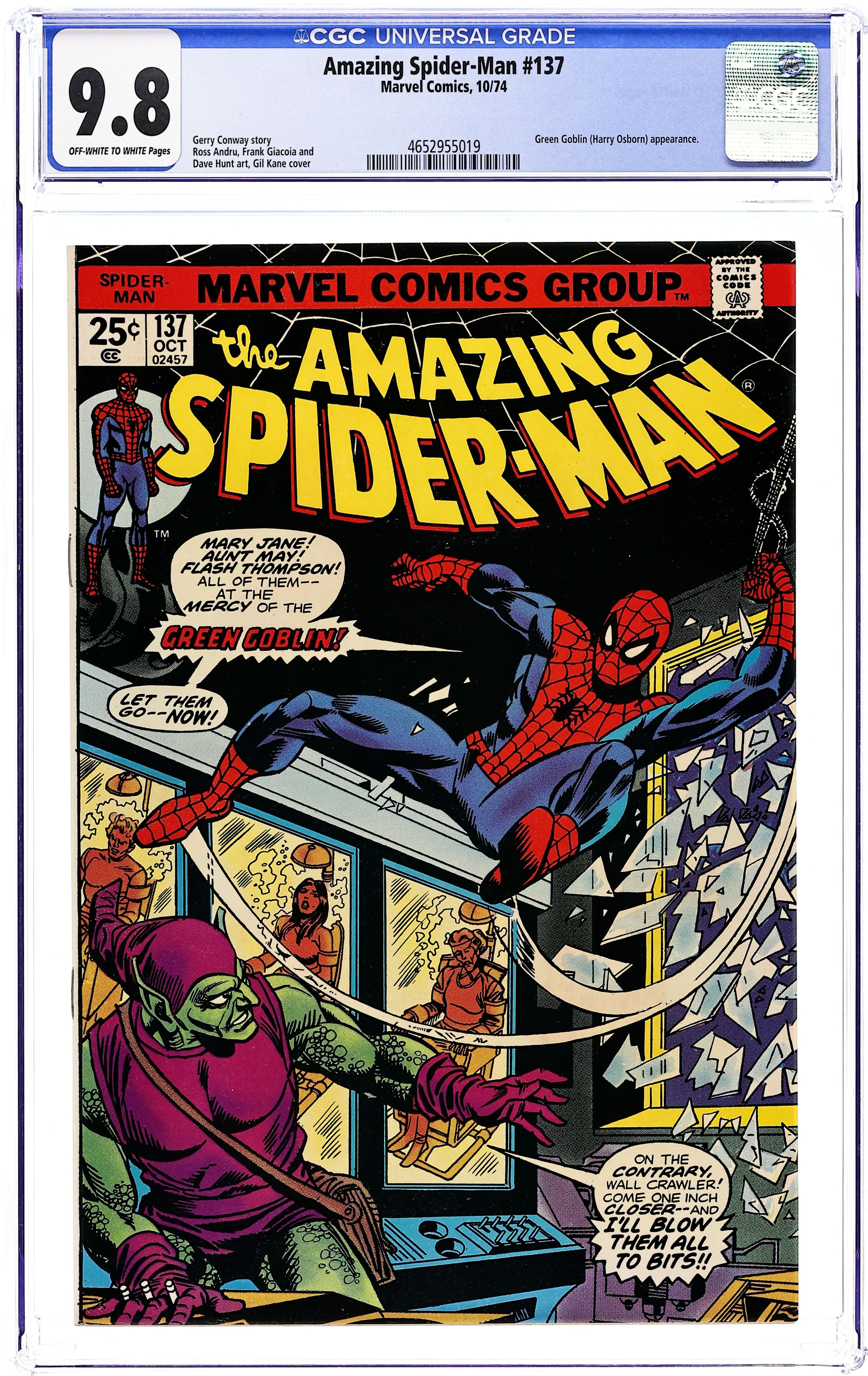 Cover by Gil Kane. Harry Osborn's second appearance as the Green Goblin in Death Trap Times Three, script by Gerry Conway, pencils by Ross Andru, inks by Frank Giacoia and Dave Hunt; Green Goblin attacks a truck carrying radioactive materials; What is the villains end goal with this dangerous bounty?; Plus, Peters friends and family rally to MJs side after she is injured by an explosive; Green Goblin makes Spider-Man choose between saving his friends, or Aunt May! Reprinted in Marvel Tales # 114. Letter to the editor from writer Charles Hoffman. The letters page also has Marvel Value Stamp series A # 99. 36 pgs., full color. $0.25. Cover price $0.25. Grade: CGC 9.8 explanation of grade Condition: Used (collectible)