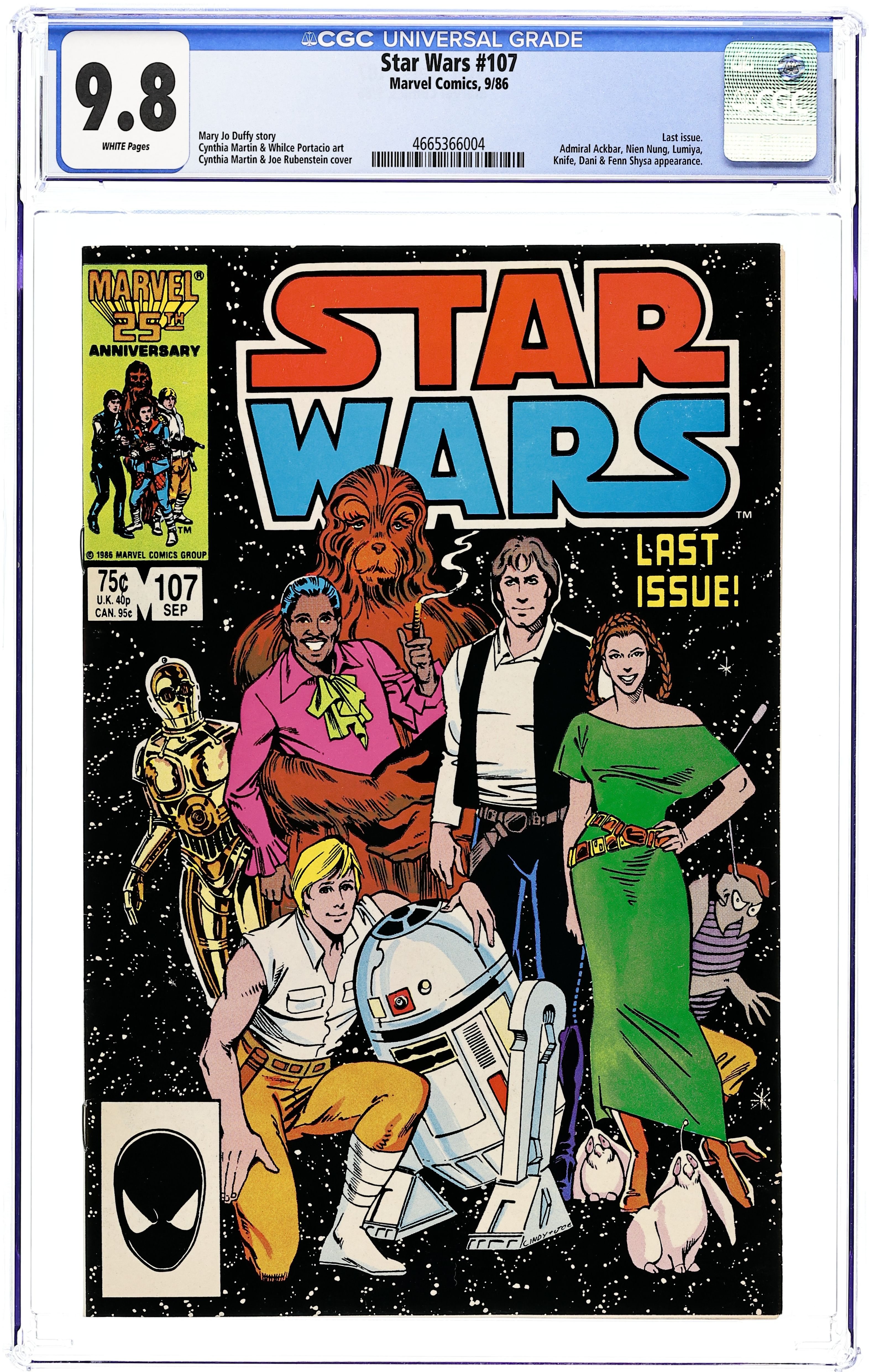 Direct Edition. Final issue. A not-so-merry band of former imperials, former rebels, Mandalorians, Zeltrons, droids and Nagai are on Saijo on a mission to capture the Tof prince in "All Together Now". Script by Jo Duffy, pencils by Cynthia Martin, inks by Whilce Portacio.(scarce) Cover price $0.75. Grade: CGC 9.8 explanation of grade Condition: Used (collectible)