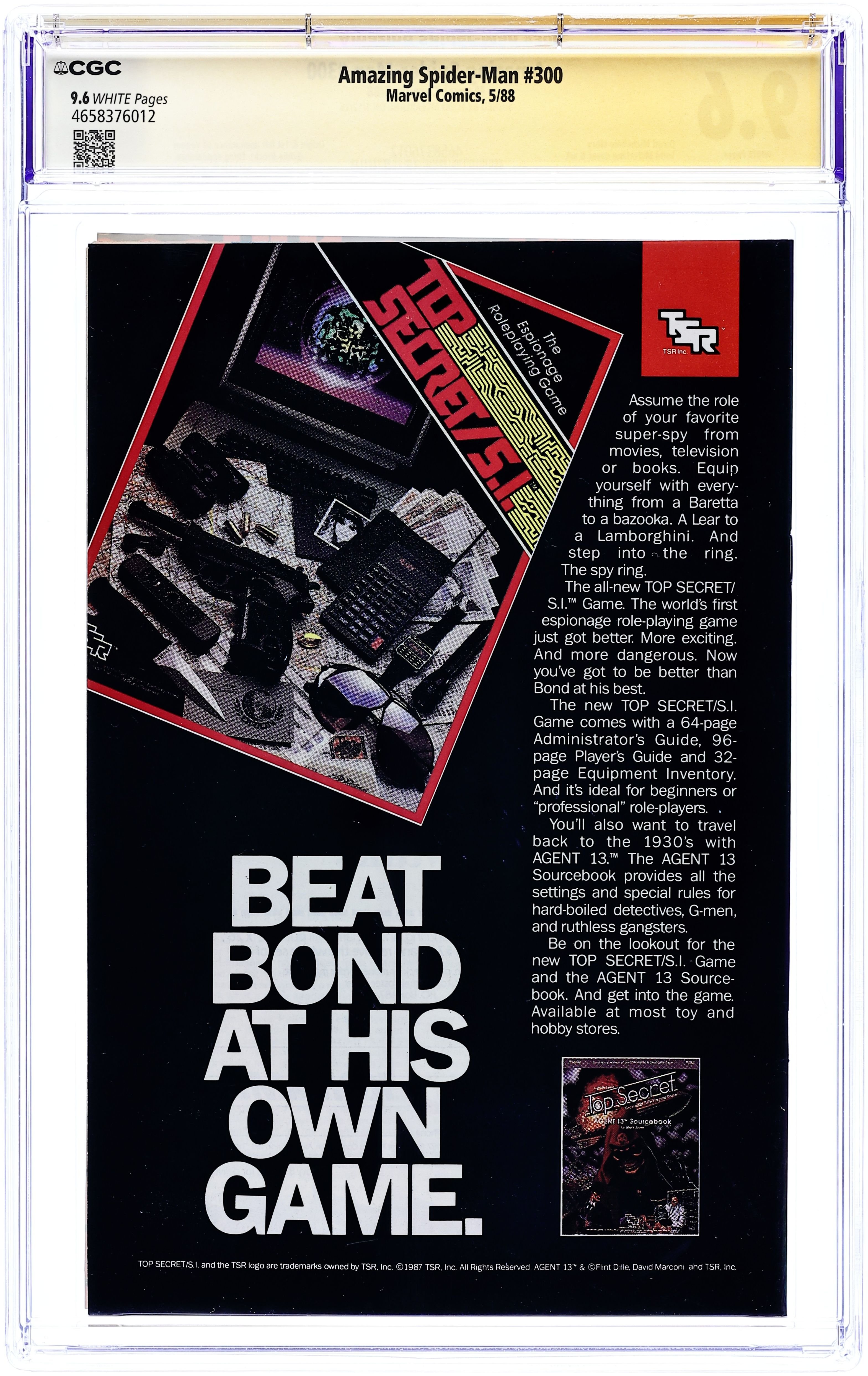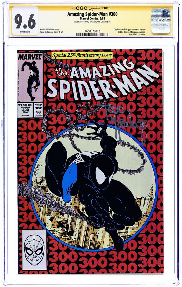 Direct Edition. Giant-sized 25th anniversary issue. First full appearance of Venom in "Venom!", script by David Michelinie, art by Todd McFarlane; Spidey's old alien costume has merged with reporter Eddie Brock who thinks his career was ruined by Spider-Man and the symbiote of the two, Venom, takes on the web slinger; At MJ's request, Spidey returns to the blue and red costume as she now finds his black duds way too creepy; This is the last issue in which Spider-Man appears in his black costume; Thing (of the Fantastic Four) cameo.. Stan's Soapbox Special in place of letters page: Full page editorial by Stan on the occasion of Spider-Man's 300th issue. 52 pgs., full color. Cover price $1.50. Grade: CGC 9.6 explanation of grade Condition: Used (collectible)