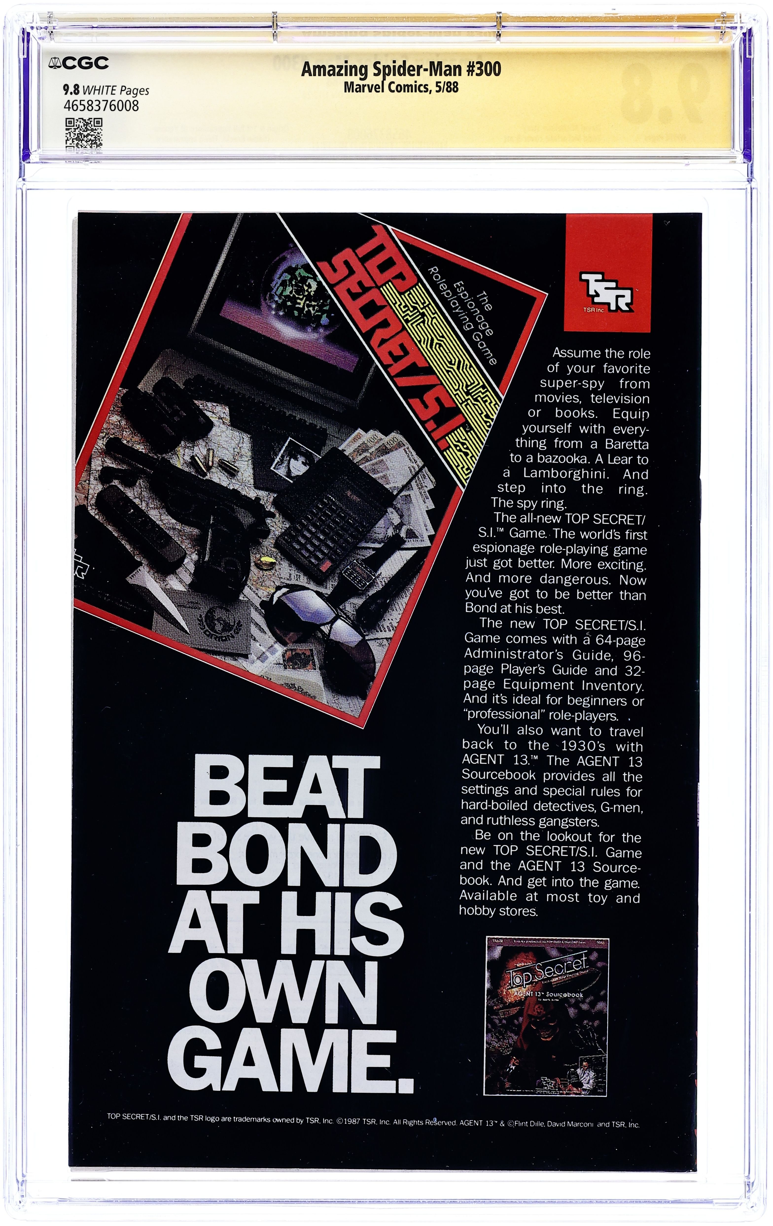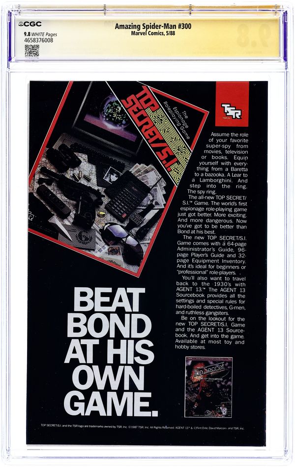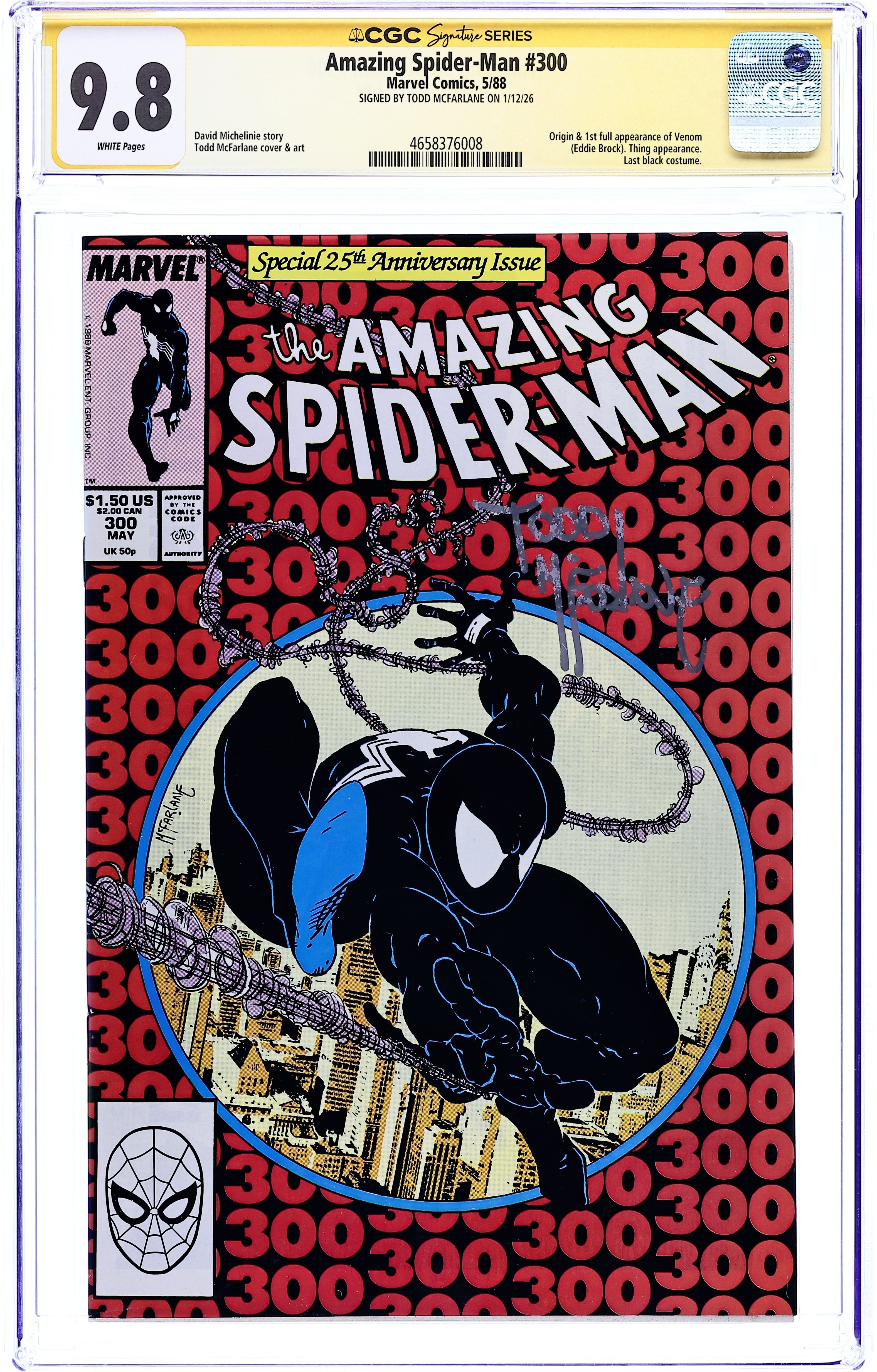 Direct Edition. Giant-sized 25th anniversary issue. First full appearance of Venom in "Venom!", script by David Michelinie, art by Todd McFarlane; Spidey's old alien costume has merged with reporter Eddie Brock who thinks his career was ruined by Spider-Man and the symbiote of the two, Venom, takes on the web slinger; At MJ's request, Spidey returns to the blue and red costume as she now finds his black duds way too creepy; This is the last issue in which Spider-Man appears in his black costume; Thing (of the Fantastic Four) cameo.. Stan's Soapbox Special in place of letters page: Full page editorial by Stan on the occasion of Spider-Man's 300th issue. 52 pgs., full color. Cover price $1.50. Grade: CGC 9.8 explanation of grade Condition: Used (collectible)