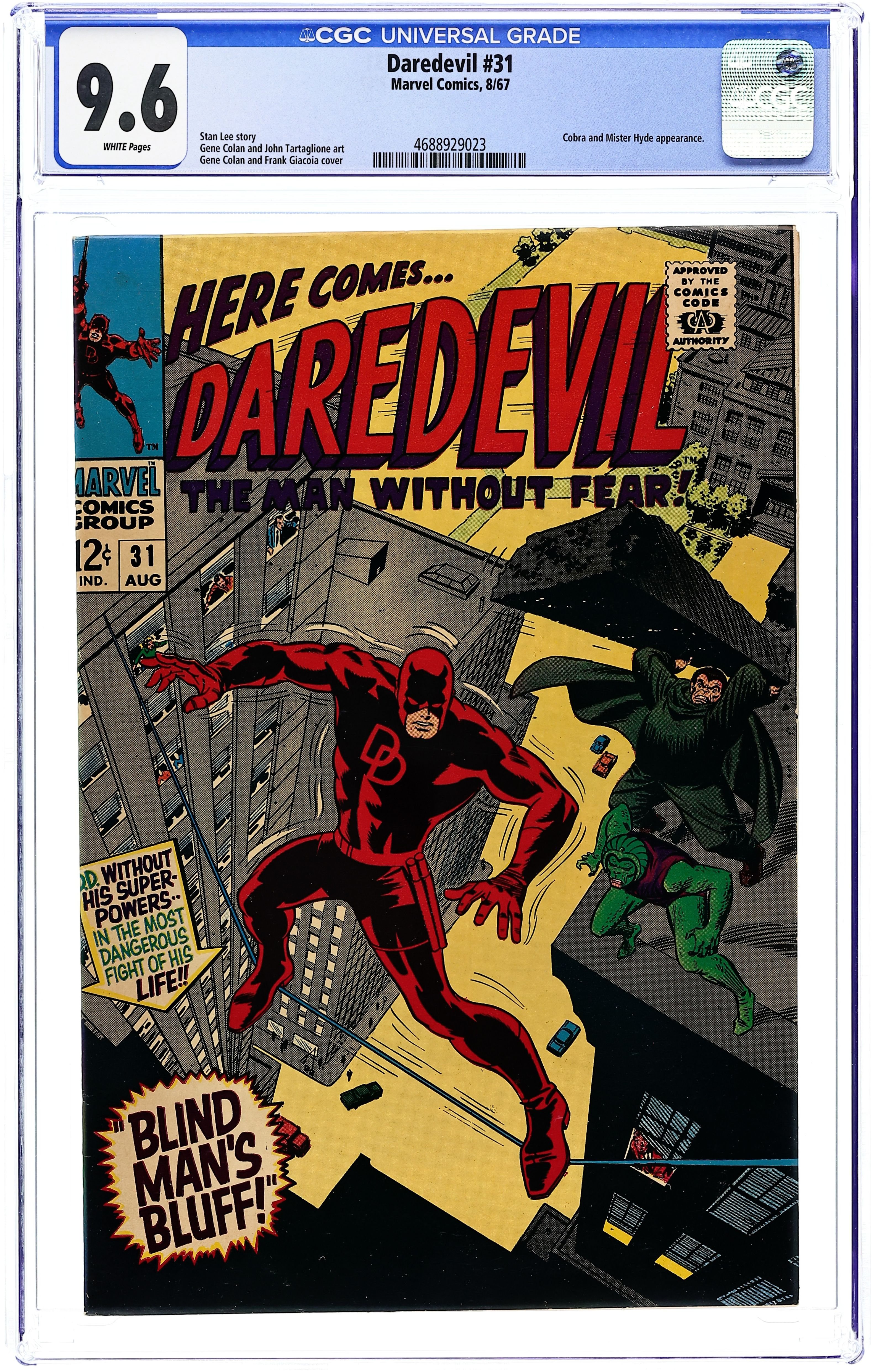 Cover pencils by Gene Colan, inks by Frank Giacoia. Blind Man's Bluff, script by Stan Lee, pencils by Gene Colan, inks by John Tartaglione; a powerless and totally blind DD has to try and tackle the combined might of Mr. Hyde and Cobra; Mike Murdock appearance. 36 pgs. Cover price $0.12. Cover price $0.12. Grade: CGC 9.6 explanation of grade Condition: Used (collectible)