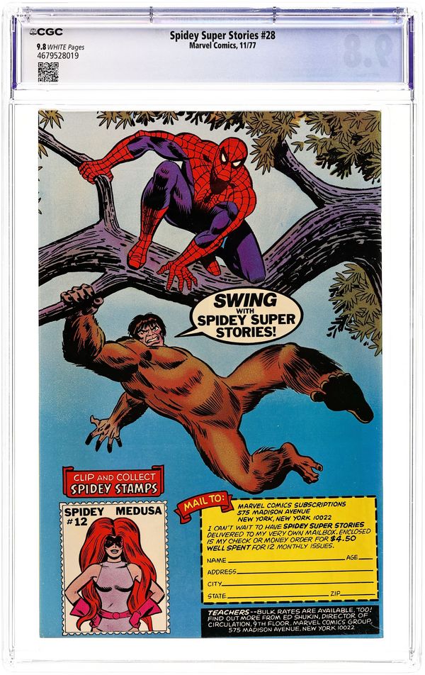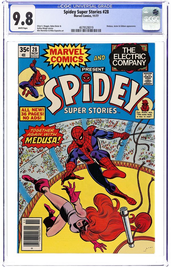 "The Great Spidey Trial!" Story by Elliot Maggin, Kolfax Mingo, and Bobo De L'air. Art by Winslow Mortimer and Mike Esposito Spidey is put on trial by the hairy-fisted villain, the Gibbon. Includes the 1-page features "All about the Gibbon," "Remember Medusa," and "Wit of the Webslinger." Includes the back-up tale "Flowers of Evil!" Guest-starring the Short Circus. Plus, Spidey and Medusa together again in "Jest in Time!" Featuring the clip and collect Spidey Stamp: #12 Medusa. Cover price $0.35. Grade: CGC 9.8 explanation of grade Condition: Used (collectible)