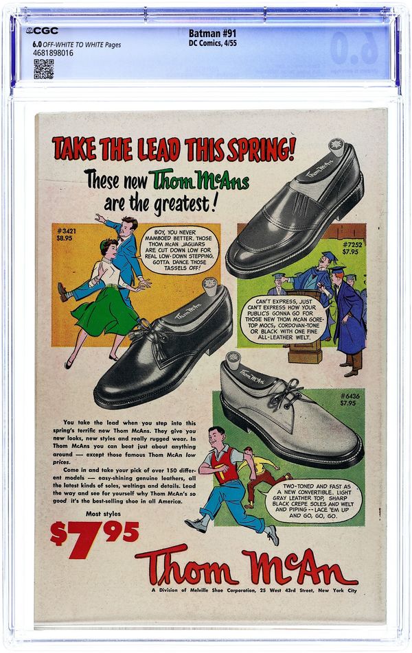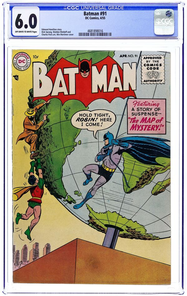Cover by Win Mortimer. Don't Be Afraid to Speak Up! public service announcement with Peter Porkchops, script by Jack Schiff, art by Rube Grossman. "The Living Bat-Plane!", script by Edmond Hamilton, pencils by Dick Sprang, inks by Charles Paris; With help from Dr. Philip Winters, Batman and Robin test the new remote controls on the Batplane and Batmobile; Unfortunately, bad guys take the controls of the Bat-vehicles and turn them against the Dynamic Duo. Batman Whirly-word Game activity page by Martin Naydel. "Batman's Publicity Agent!", pencils by Sheldon Moldoff, inks by Charles Paris; A publicity agent named Mike Whalen starts a city wide publicity stunt in honor of Batman; The Caped Crusader finds it flattering, but the constant exposure of Batman-themed stunts interfere with his crime-fighting career. One-page Playful Pop and the Kiddies story. "The Strangest Lawmen on Earth" text story. One-page Casey the Cop story by Henry Boltinoff. "The Map of Mystery!", script by Edmond Hamilton, pencils by Dick Sprang (as Bob Kane), inks by Charles Paris; An explorer from the famed "Explorer's Club" sets out to find an ancient lost city of the Incas, but refuses to share his secret with other members and eventually disappears; Batman is called in by the other Club members to track down their fellow member and find this lost city, not realizing one of the member wishes to loot the city. 36 Pages, Full Color. Cover price $0.10. Grade: CGC 6.0 explanation of grade Condition: Used (collectible)